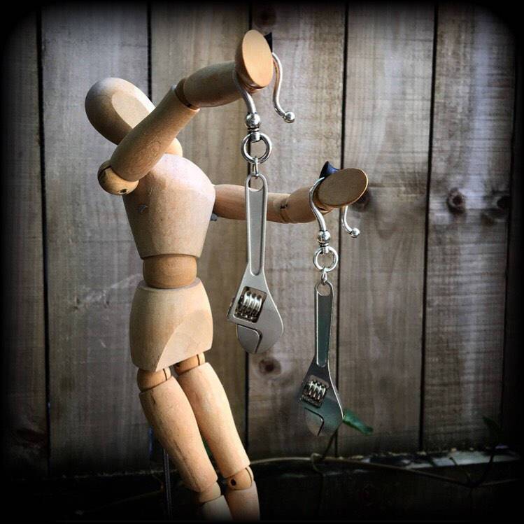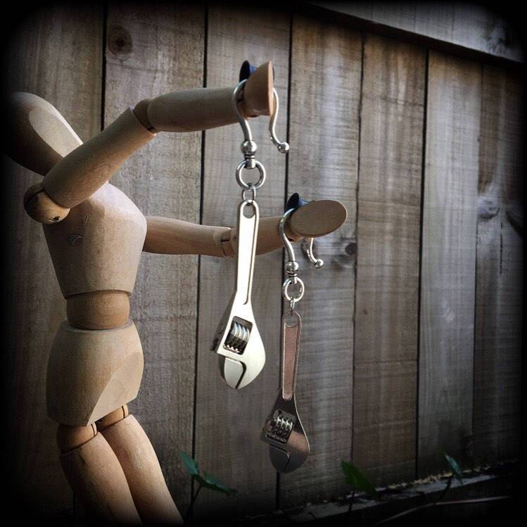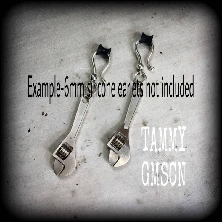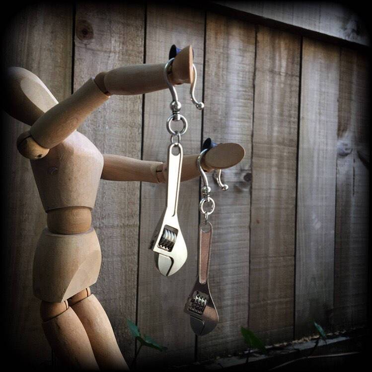 These quirky novelty light weight 'Monkey Wrench' earrings measure just on 11cms and feature a large antique silver shephards hook, suitable for stretched lobes when worn with silicone earlets from 6mm/2 gauge and larger.