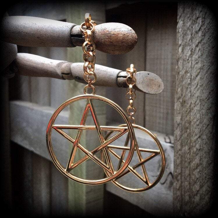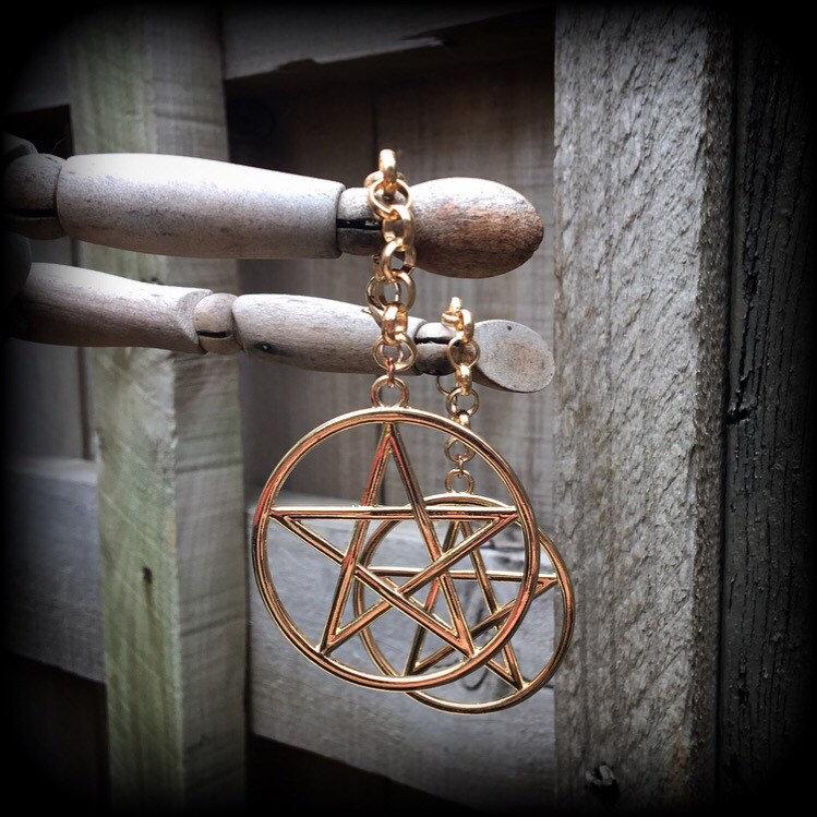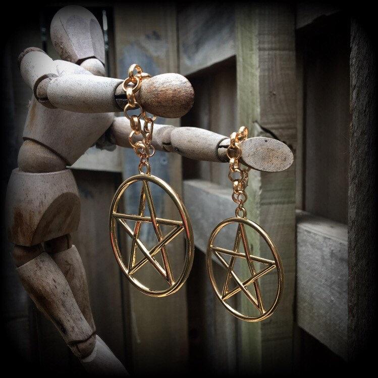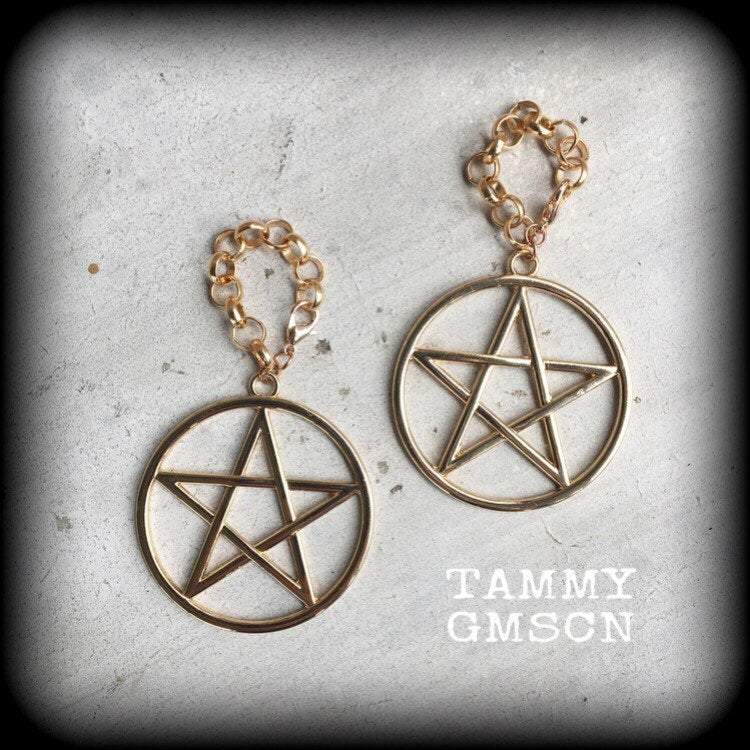 The antique silver 'Pentagram' ear hangers are light weight (14 grams each), and nice and dangly, measuring just on 9cms, and made on chunky antique gold bolo chain and lobster clasp to be worn through silicone earlets or tunnels in stretched ears 10mm and larger.
