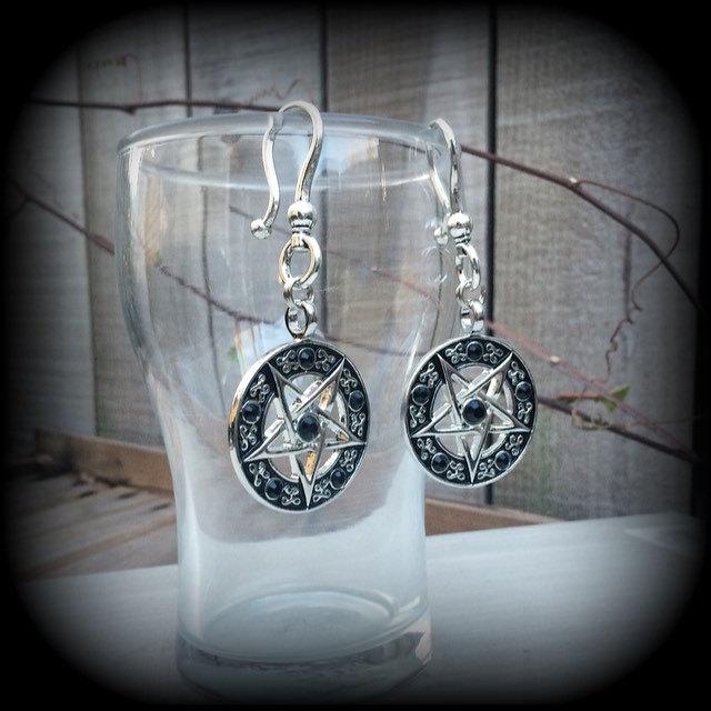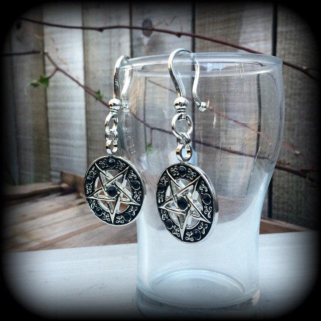 These pentagram tunnel dangles are light weight (weighing 14grams a piece) and nice and dangly, measuring just over 8cms, and made on large antique silver shephards hooks to be worn through silicone earlets in stretched lobes.