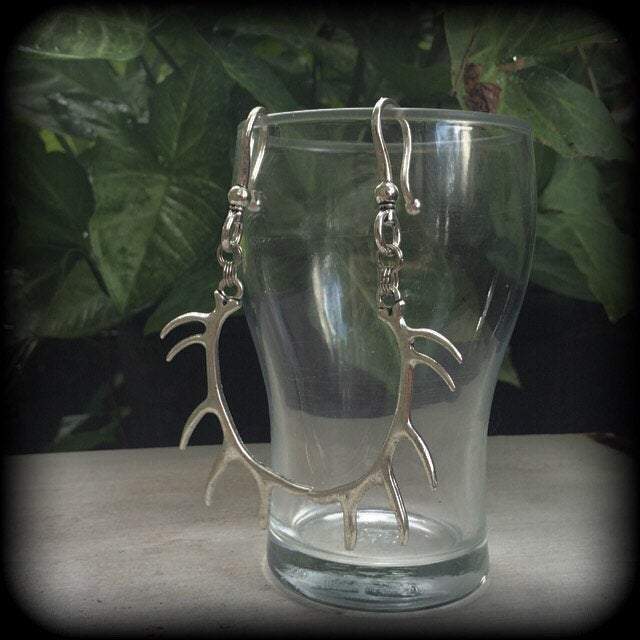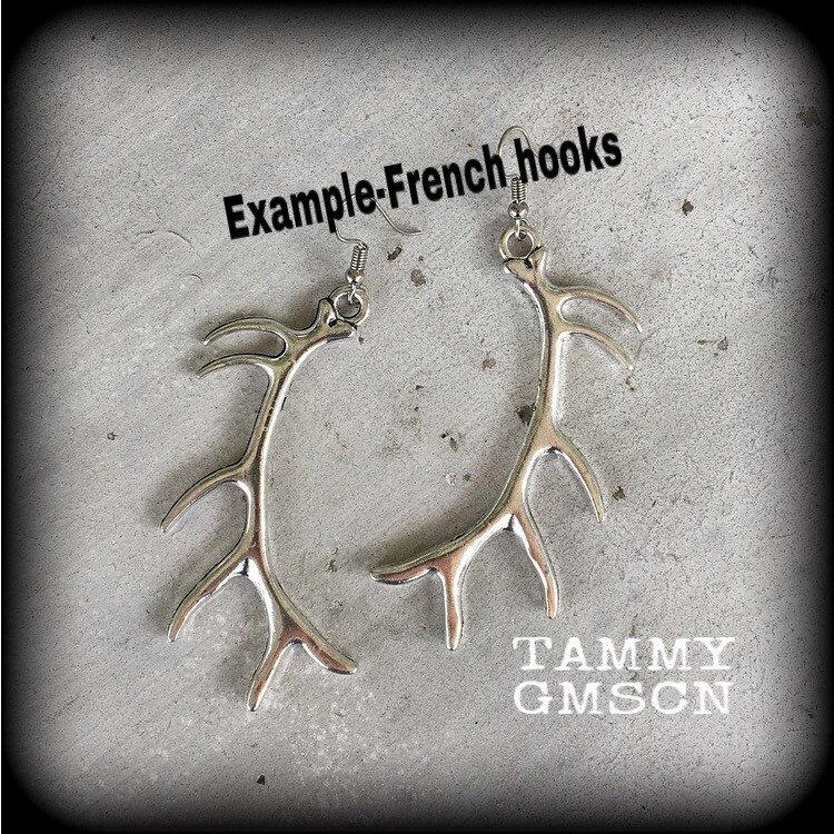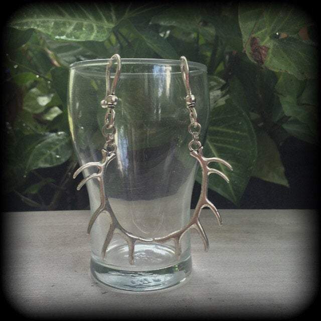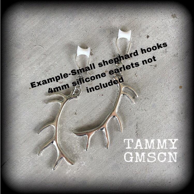 These earrings are nice and light weight featuring antique silver caribou antlers, measuring just on 11cms from tip to tip and made on large antique silver shephards hooks to be worn through stretched lobes with silicone earlets 6mm/2 gauge and larger. Please choose from the first 3 options in the drop down menu if you would like these made for pierced ears.