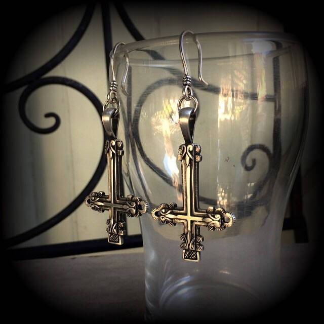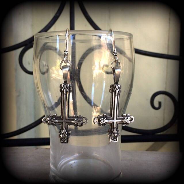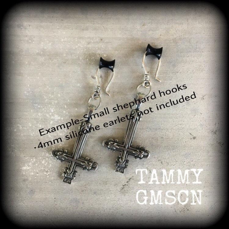 These pewter and antique silver and 'Inverted Cross' ear weights measure just over 8cms, (weighing 8 grams a piece) and made on small antique silver shephards hooks to be worn through stretched lobes with silicone earlets from 8 gauge.