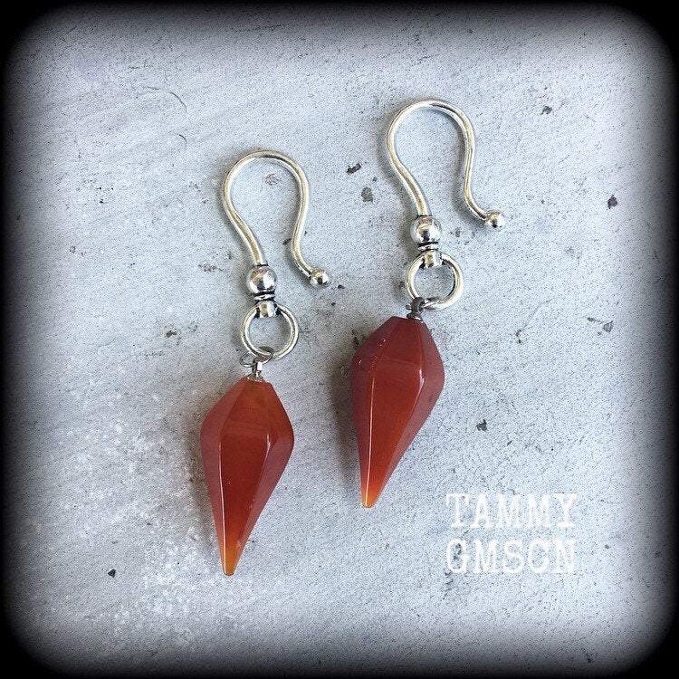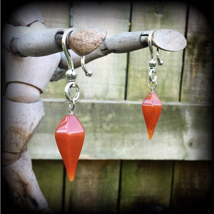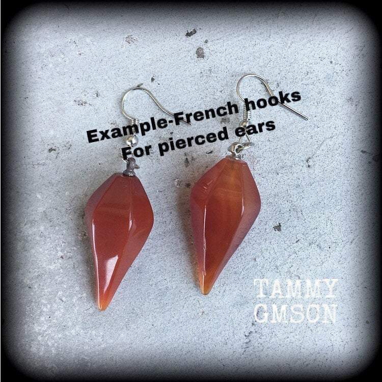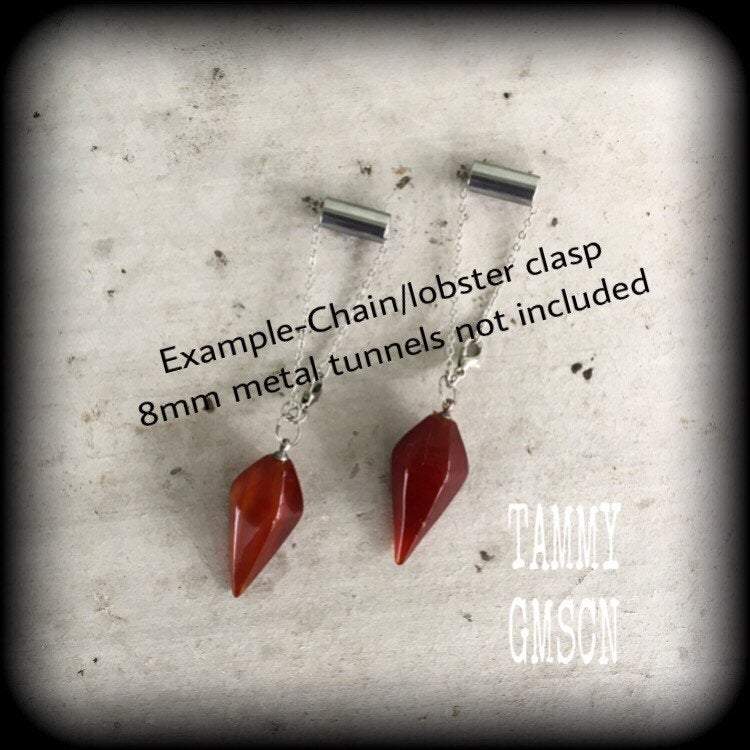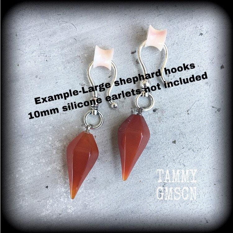 These tunnel dangles are made for stretched lobes, with gorgeous Red Jasper divination pendulums and large antique silver shephard hooks to be worn through silicone earlets in stretched lobes from 2 gauge/6mm.