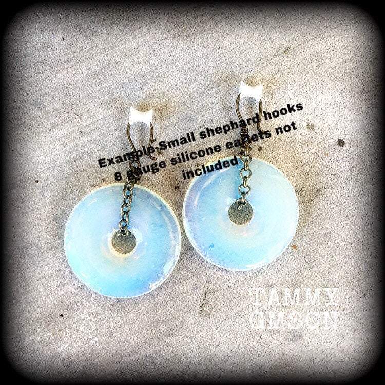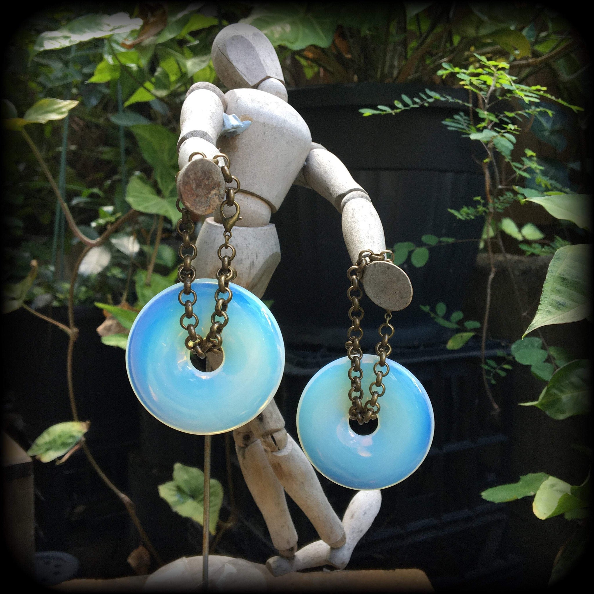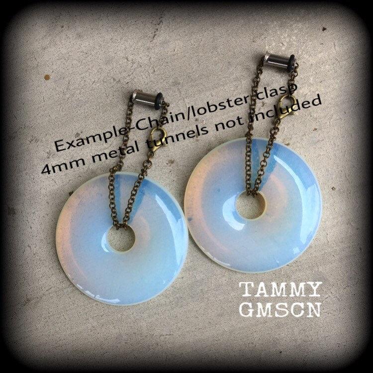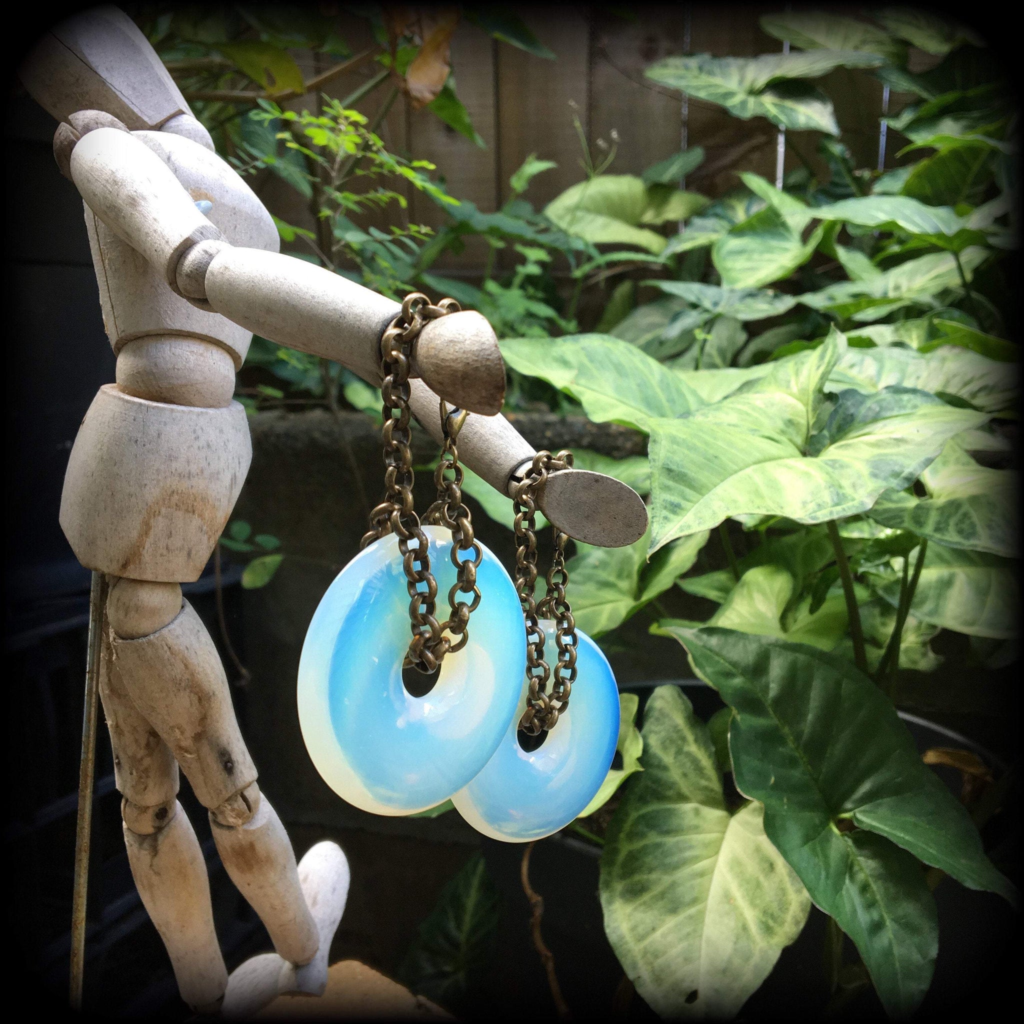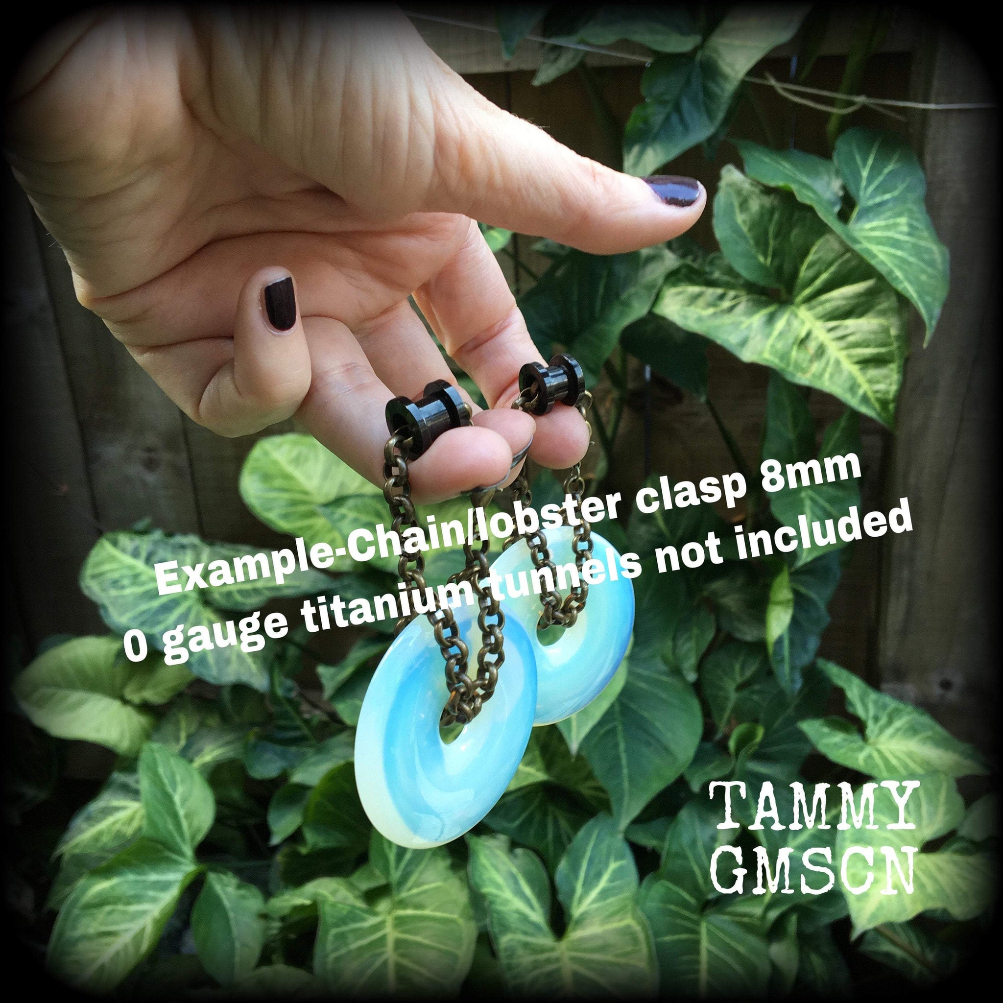 These are a pair of gorgeous minamalist iridescent Opalite ear weights, made with antique bronze chain and antique bronze lobster clasps, to be worn specifically through silicone earlets or tunnels in stretched lobes from 8mm/2 gauge and larger.