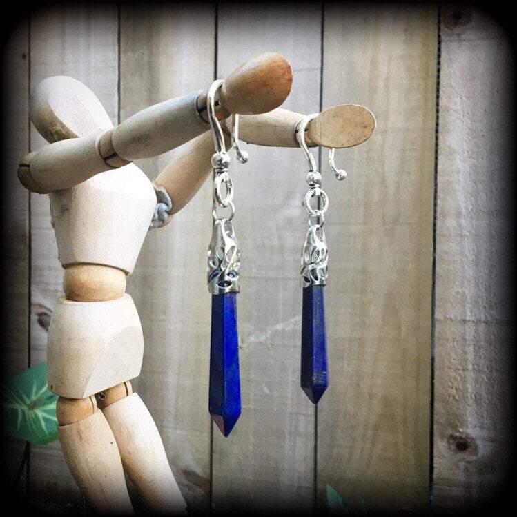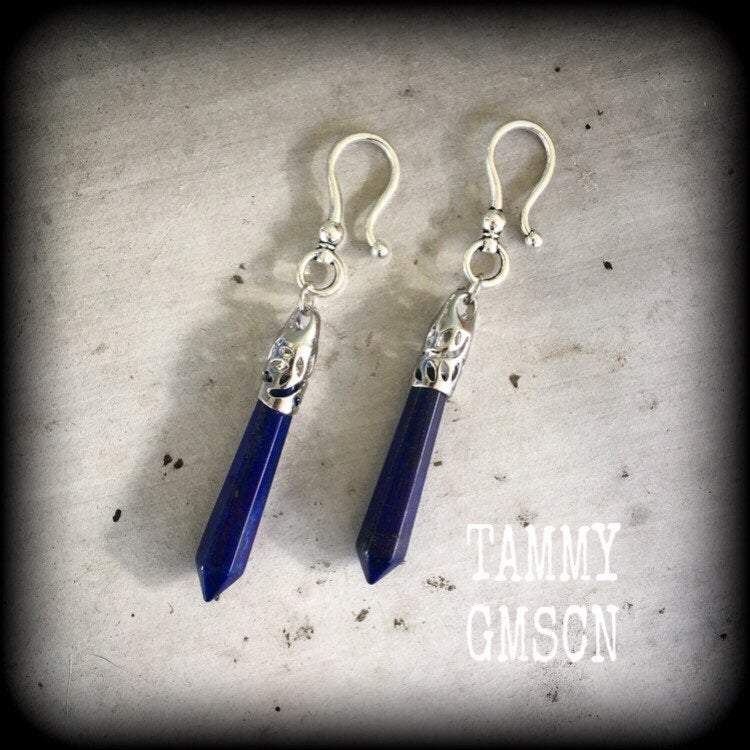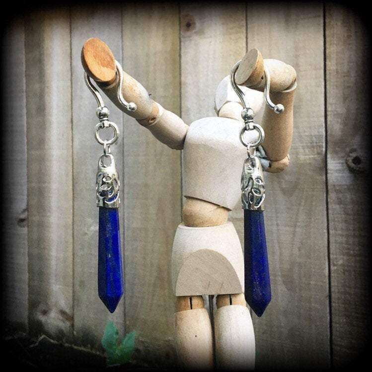 This pair of Lapis Lazuli earrings have been made for stretched lobes, made on large antique silver shephards hooks to be worn through silicone earlets from 2 gauge/6mm and larger.