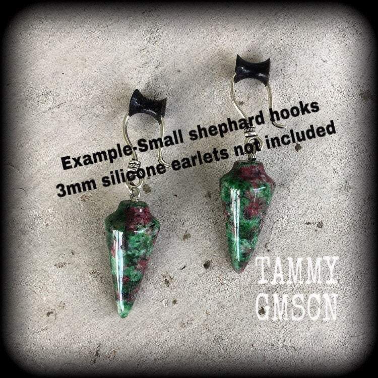 These light weight ear hangers are made with beautiful Ruby in Fuchsite pendulums, and are nice and dangly measuring just over 6cms from tip to tip, made with small antique silver shephards hooks, to be worn through stretched lobes with silicone earlets.