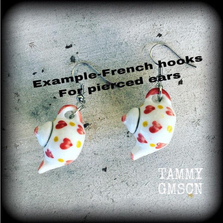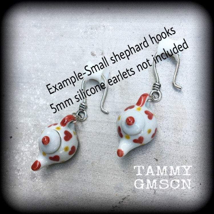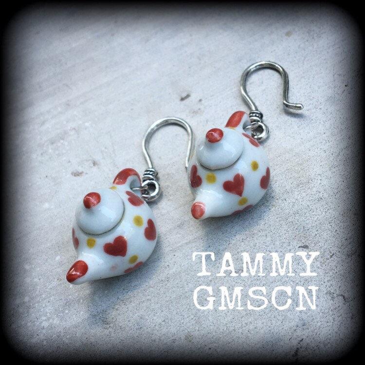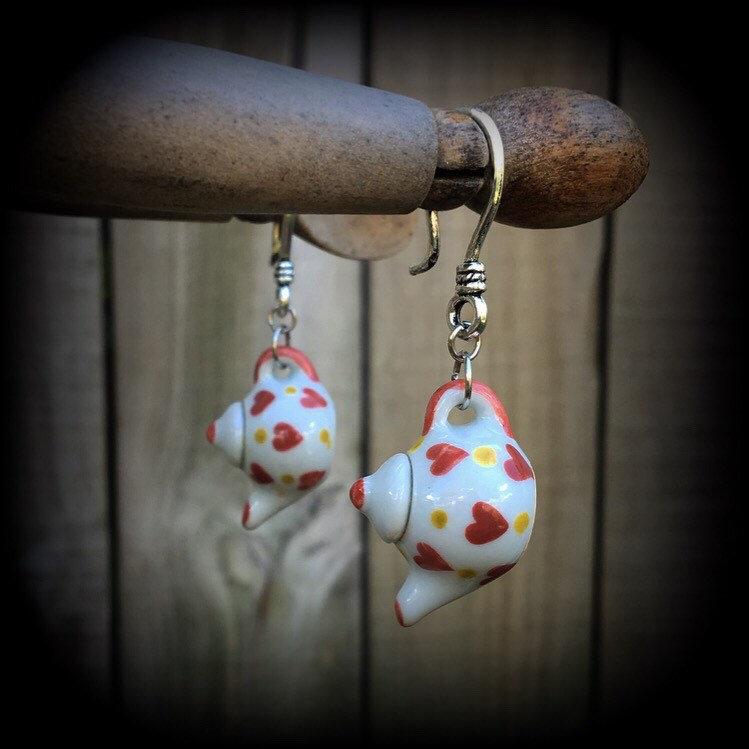 These cute as a button ceramic polka dot and red love heart tea pot earrings are inspired by Alice in Wonderland! Measuring just on 6cms from tip to tip, these earrings have been made on a small antique silver shephards hook, suitable to be worn through silicone earlets in stretched lobes from 3mm/8 gauge, and weighing only a few grams each, so light enough for pierced ears as well.