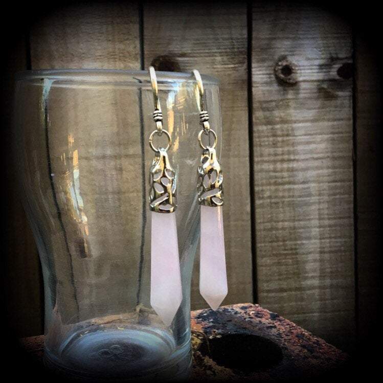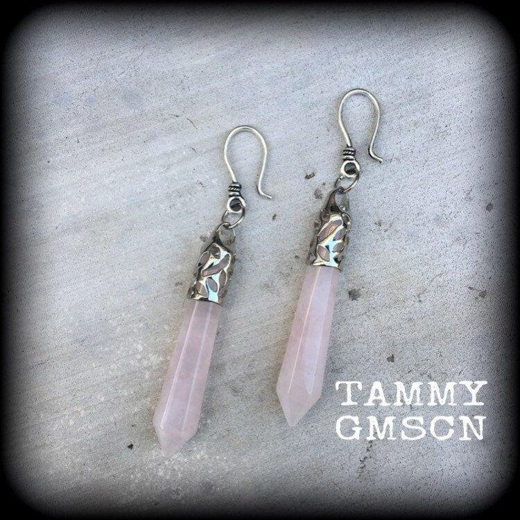 These ear hangers are made with gorgeous rose quartz divination pendulums and small antique silver shephard hooks, to be worn through silicone earlets in stretched lobes.