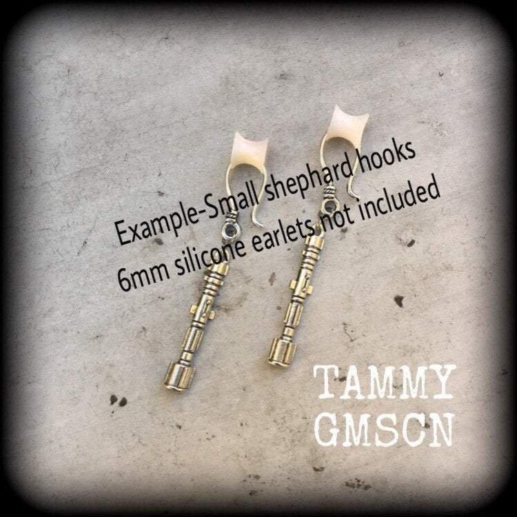 These cute little antique silver 'Sonic screwdriver' tunnel dangles are light weight and nice and dangly, measuring just on 6.5cm, and made on small antique silver shephard hooks, to be worn through silicone earlets in stretched ears from 3mm/8 gauge.