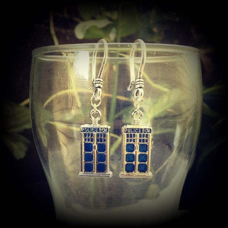 These cute little antique silver 'Tardis' ear hangers are light weight and nice and dangly, measuring just on 5.5cm, and made on small antique silver shephard hooks, to be worn through silicone earlets in stretched ears from 3mm/8 gauge.