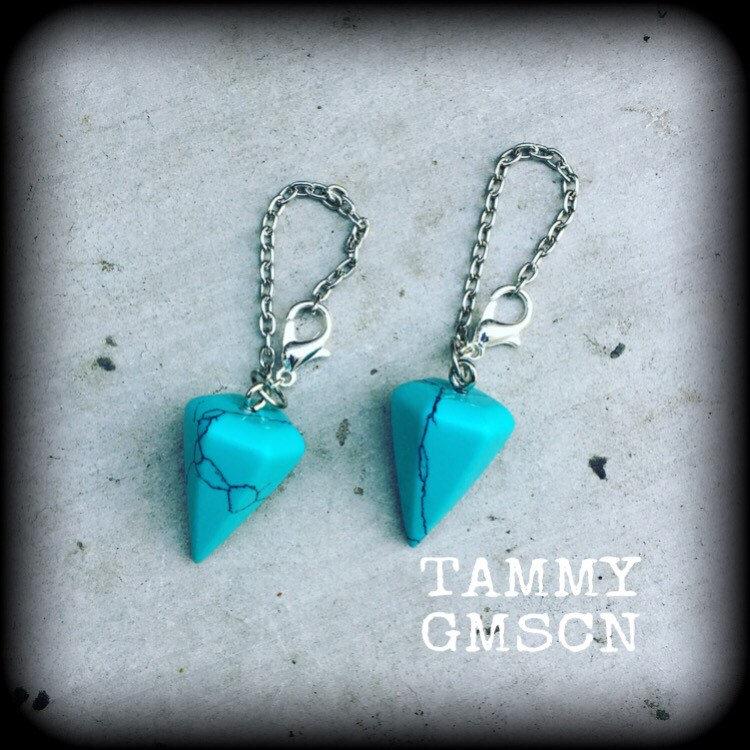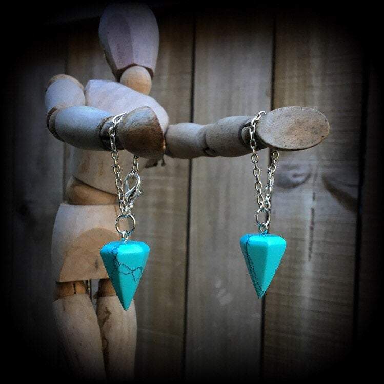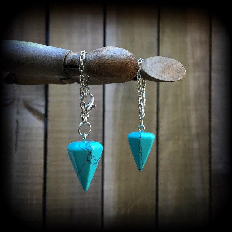 These ear hangers are made with gorgeous turquoise howlite divination pendulums and made on antique silver chain and lobster clasp, to be worn through silicone earlets and metal tunnels from 4mm and larger..