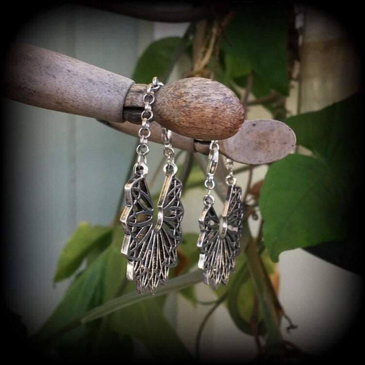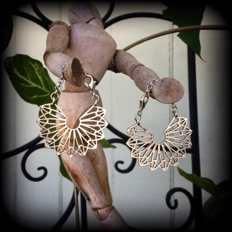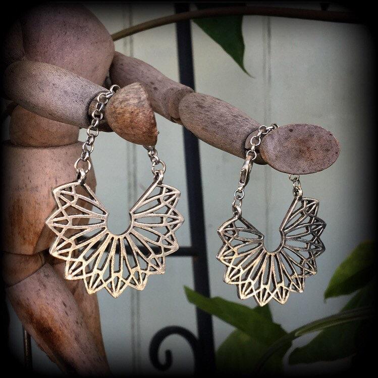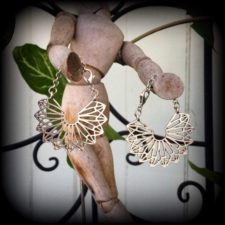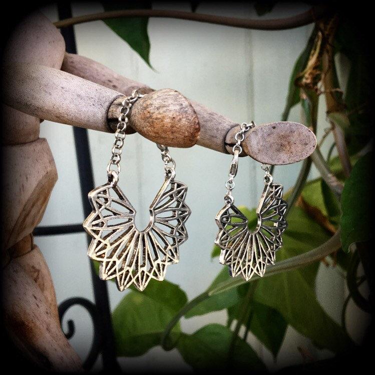 These ear hangers are from the Geometrica range of pieces inspired by Sacred Geometry, with gorgeous antique silver mandala hangers on antique silver chain and lobster clasps, to be worn through tunnels and earlets in stretched lobes from 4mm/6 gauge.