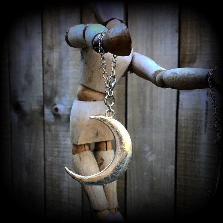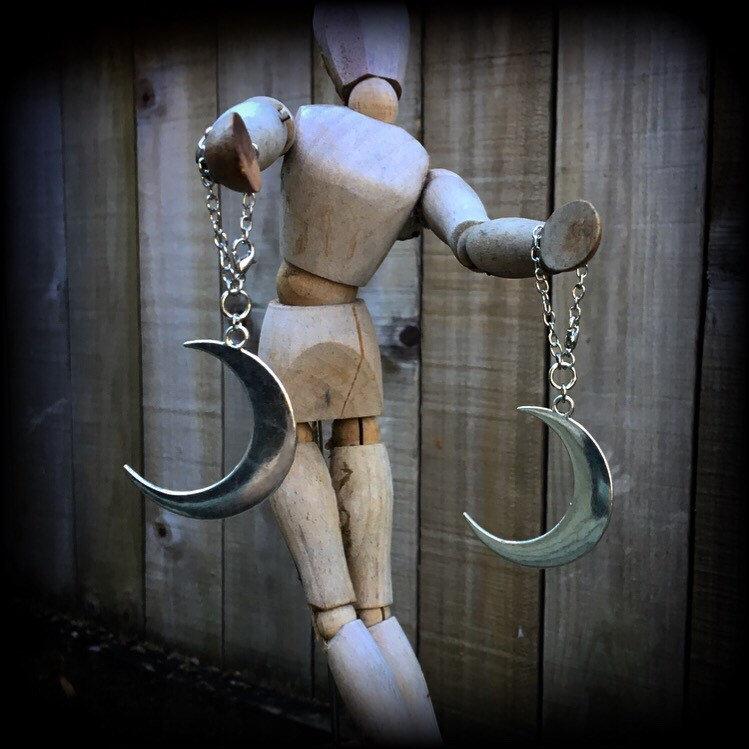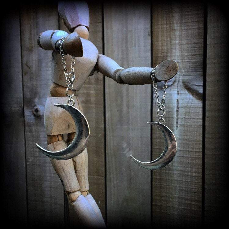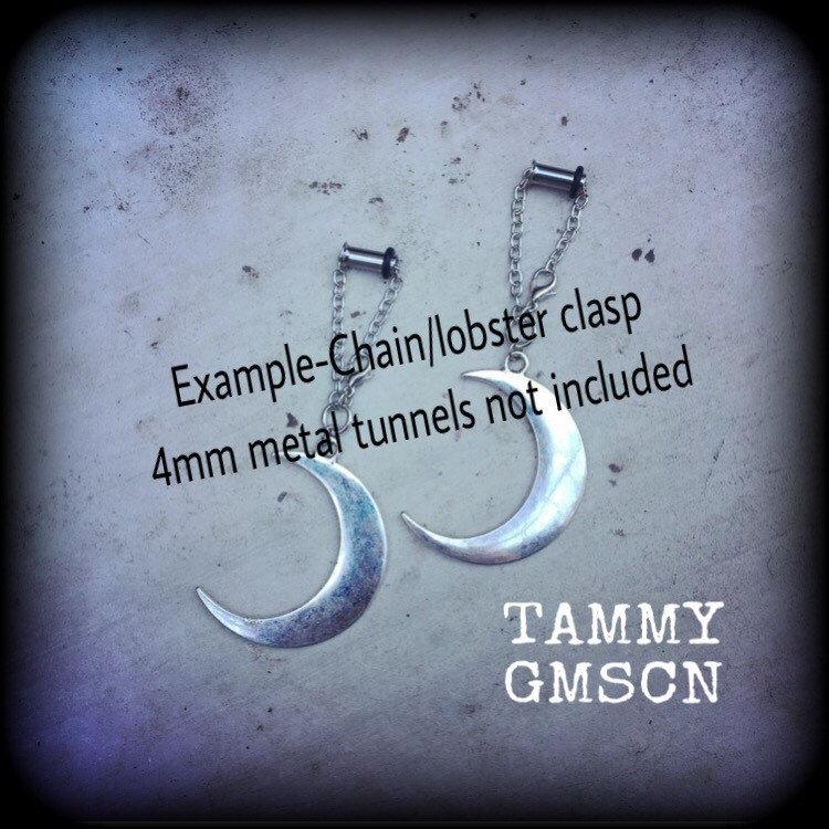 Featuring large antique silver crescent moons with chain and lobster clasp to fit through tunnels as small as 4mm/6gauge, these 'Moon Child' ear weights measure just under 7cms and look great!
