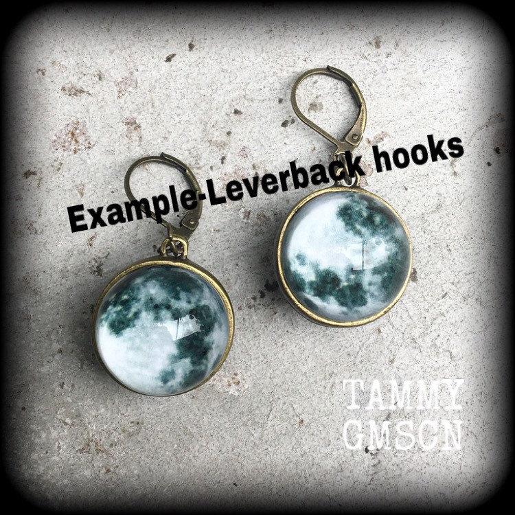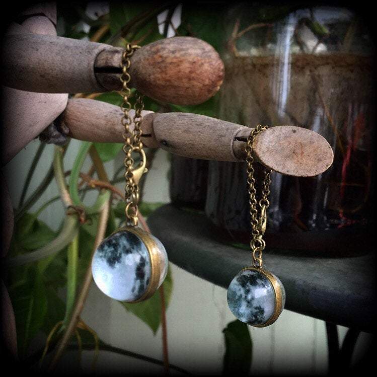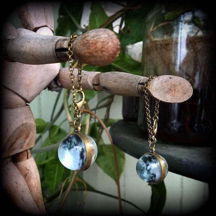 These antique bronze full moon ear hangers measure approx 7cms, made with antique bronze chain and lobster clasp, to be worn through silicone earlets in stretched lobes.