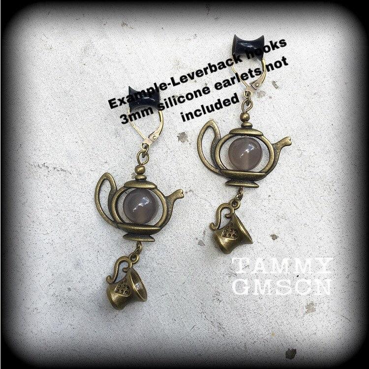 6 gauge ear hangers, Tea pot plug dangles, Ear weights, Tunnel dangles, Alice in Wonderland, Bronze weights, Hanging gauges, Gauged earrings