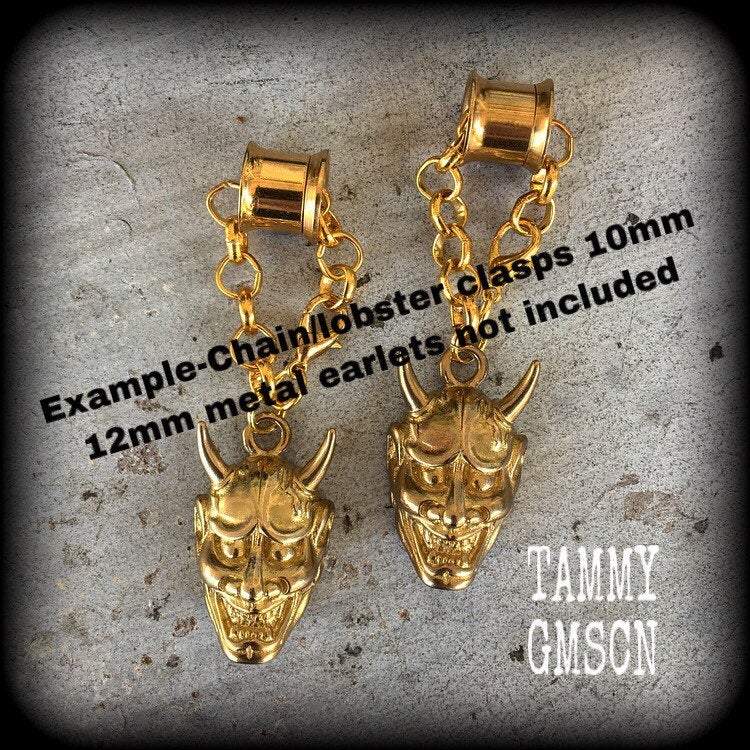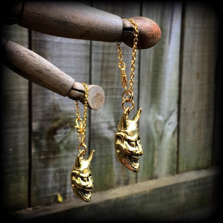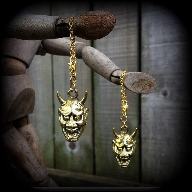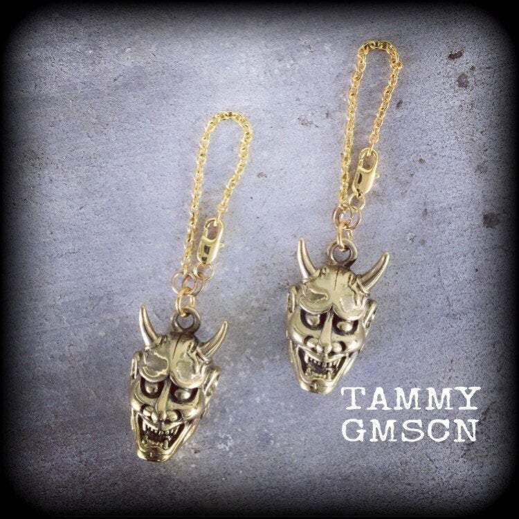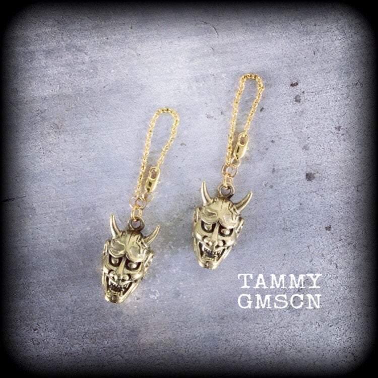 6 gauge weights, 4 gauge ear hangers, Hannya Mask ear weights, 4mm tunnel dangles, 5mm plug dangles, Plug earrings, For stretched ears