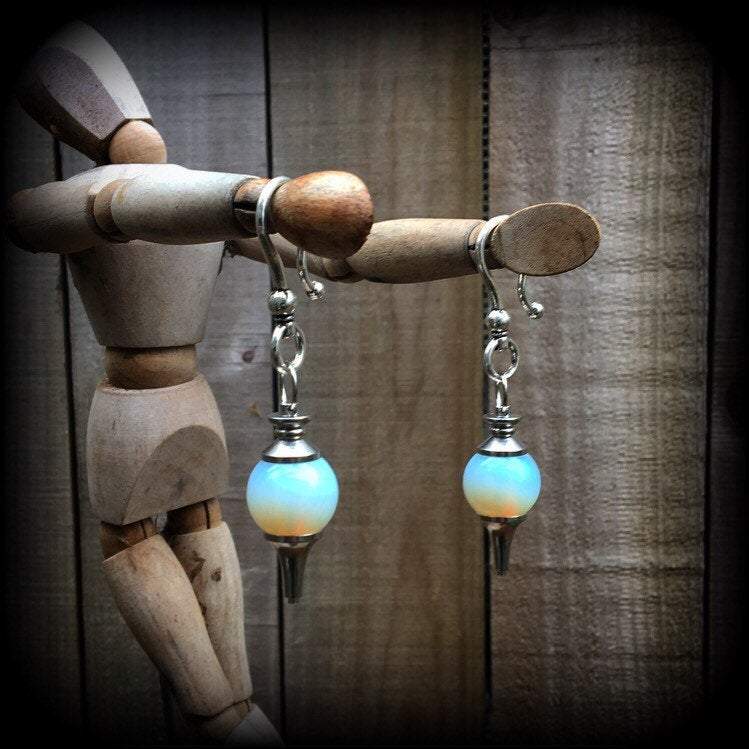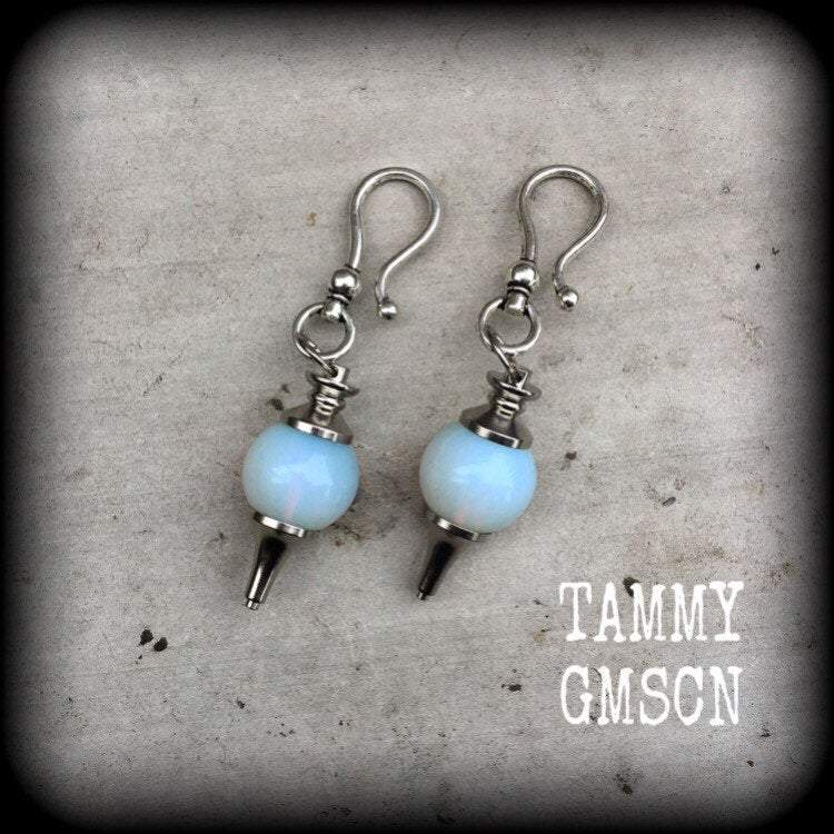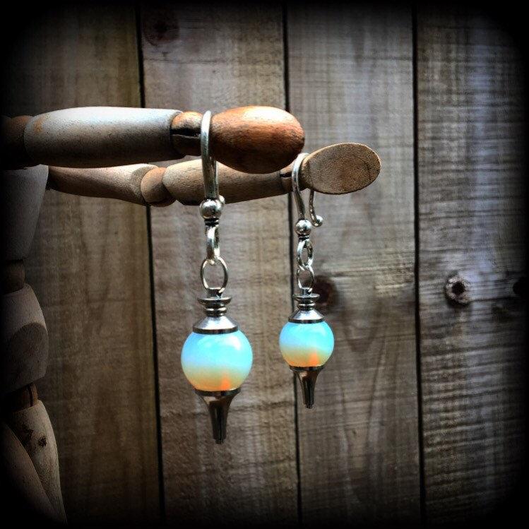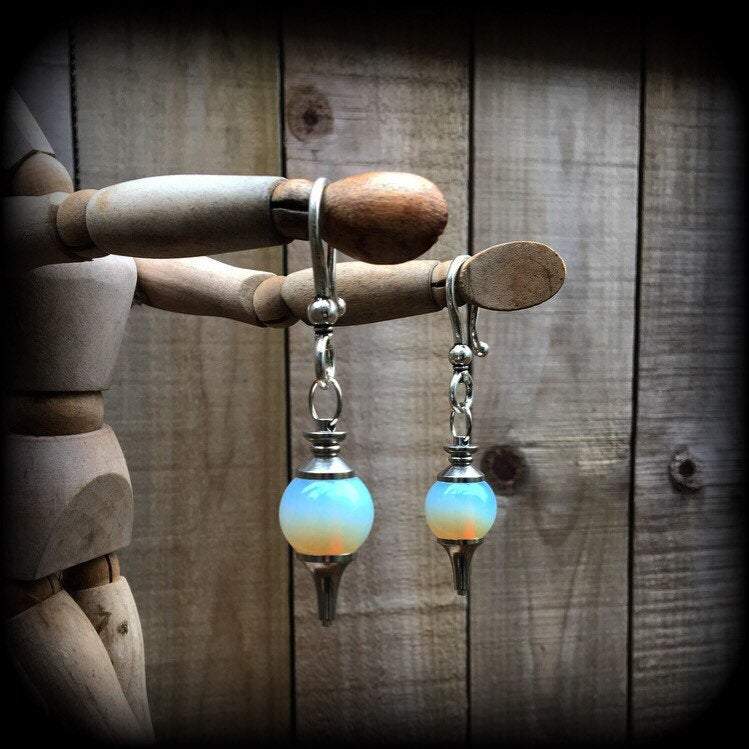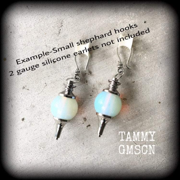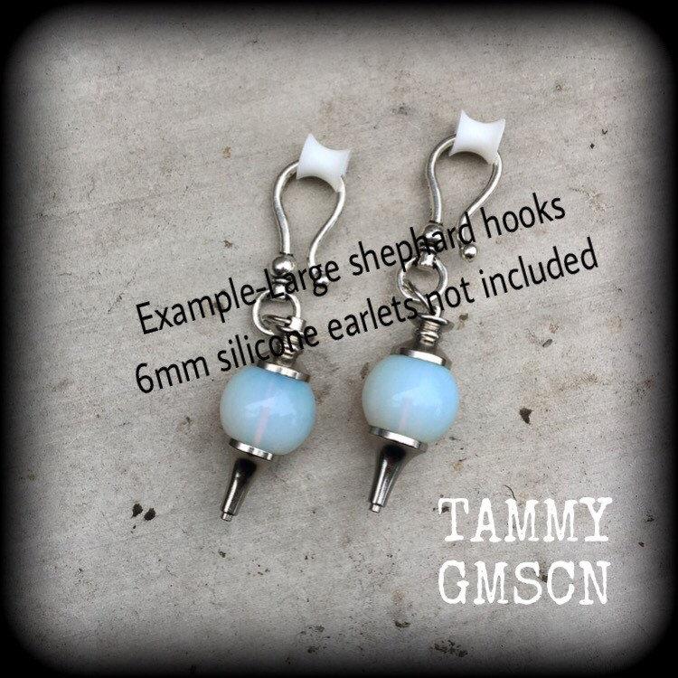 These ear hangers are made with gorgeous opaque Opalite divination ball pendulums with large antique silver shephard hooks to be worn through earlets in stretched lobes 2 gauge and larger.