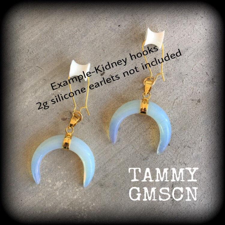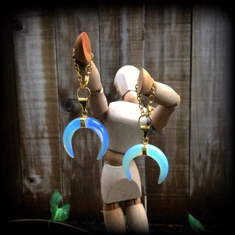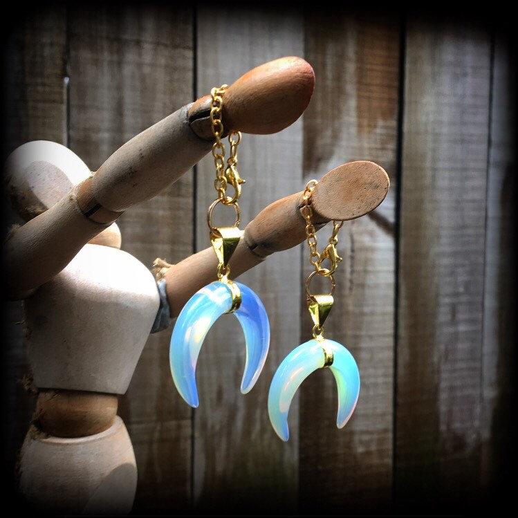 The Gemstone Fossil and Wood range of jewellry features earrings and ear weights made from beautiful gemstones and gorgeous fossils. These ear hangers are made with gorgeous opalite crescent moons with boho gold chain and lobster clasp, to be worn through silicone earlets in stretched lobes from 4mm/6 gauge.
