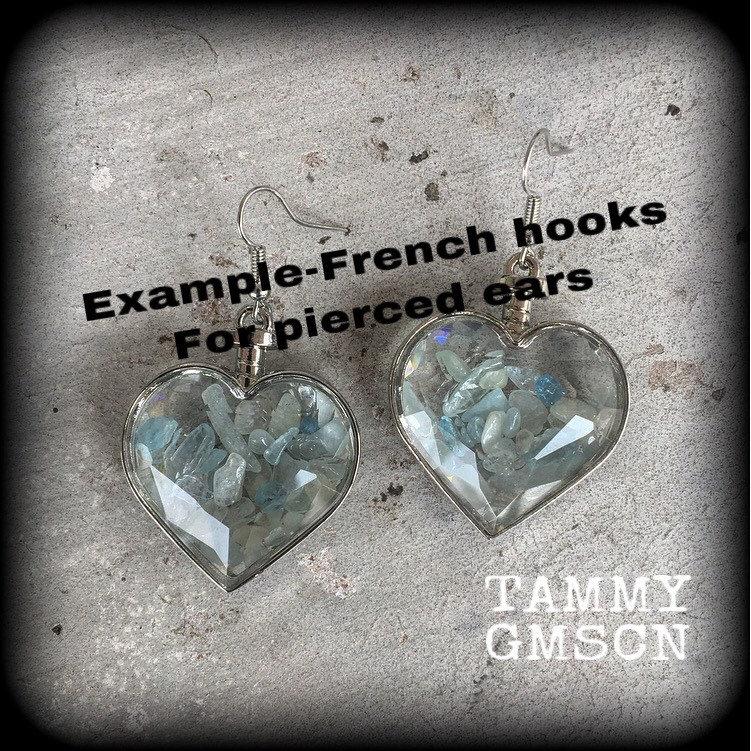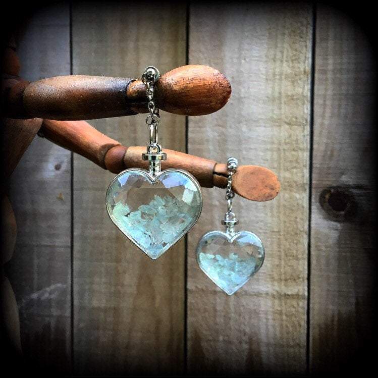 These are a pair of gorgeous plump iridescent 'Aquamarine Heart' faceted earrings, filled with pastel aquamarine chips, made on chain and magnetic clasps to be worn specifically through silicone earlets in stretched lobes from 6mm/4 gauge.
