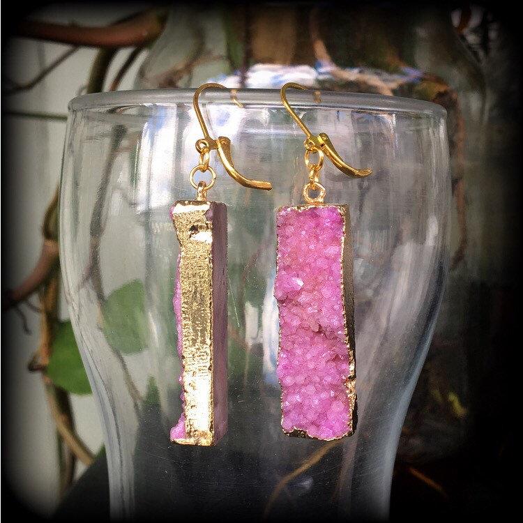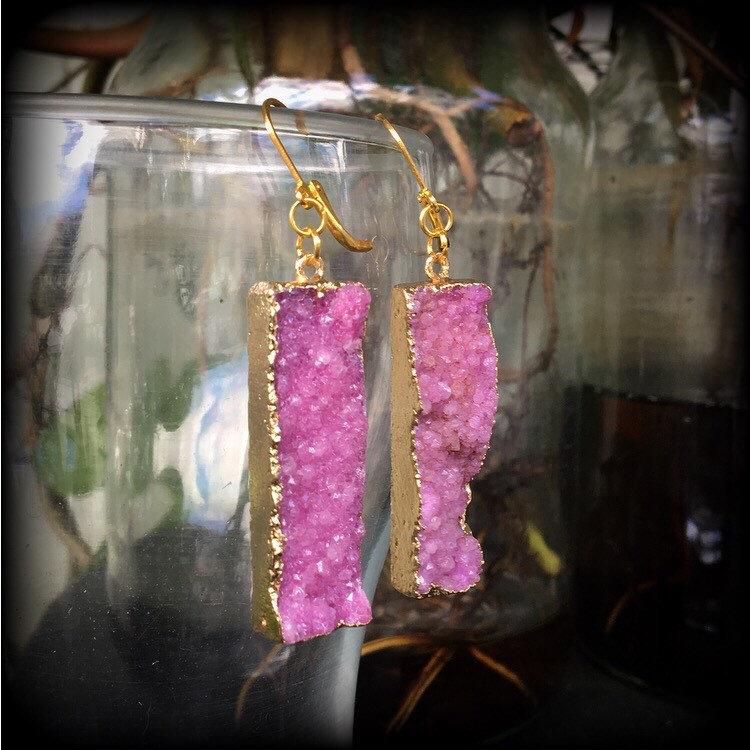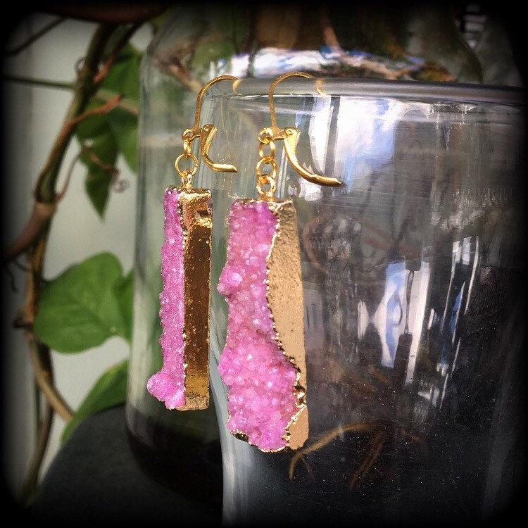 The latest addition to the Gemstone Fossil Wood range are the gorgeous magenta druzy gem ear weights, made with gorgeous druzy bars, on leverback hooks, suitable to be worn specifically through pierced ears or earlets in stretched lobes.