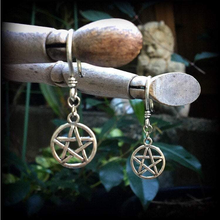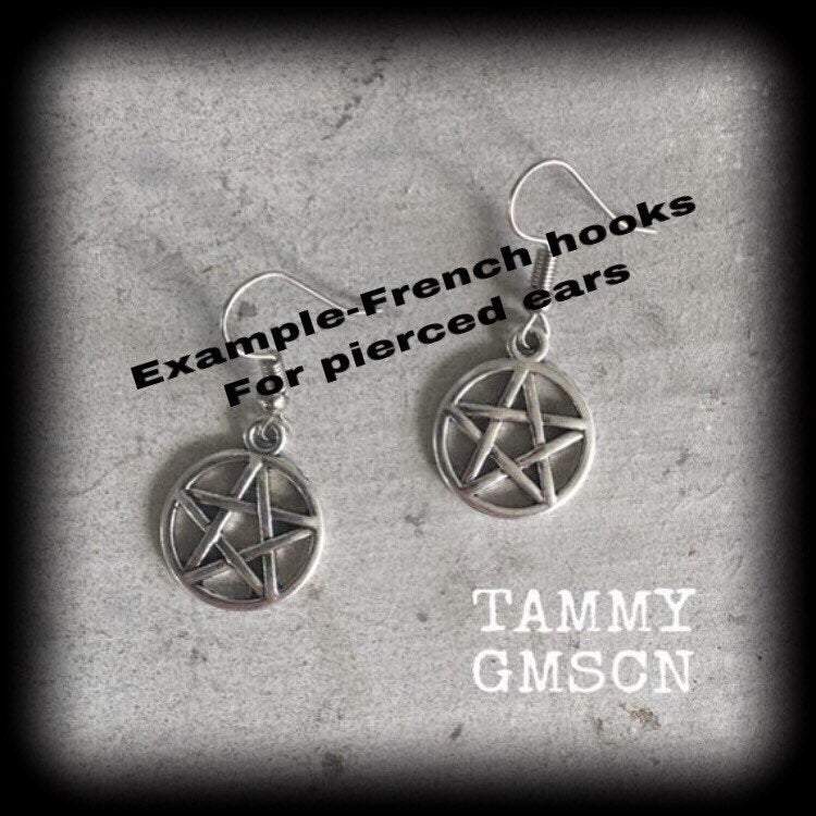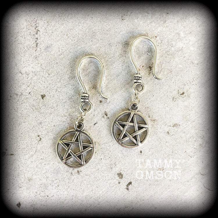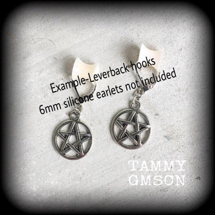 The antique silver 'Pentagram' ear hangers are light weight and nice and dangly, measuring just over 4cms, and made on small antique silver shephard hooks, to be worn through silicone earlets in stretched ears.