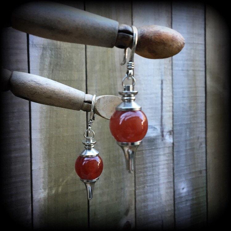 These ear hangers have been made with gorgeous Red Jasper divination ball pendulums and small antique silver shephard hooks, to be worn in stretched ears with silicone earlets.