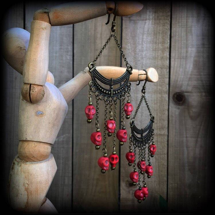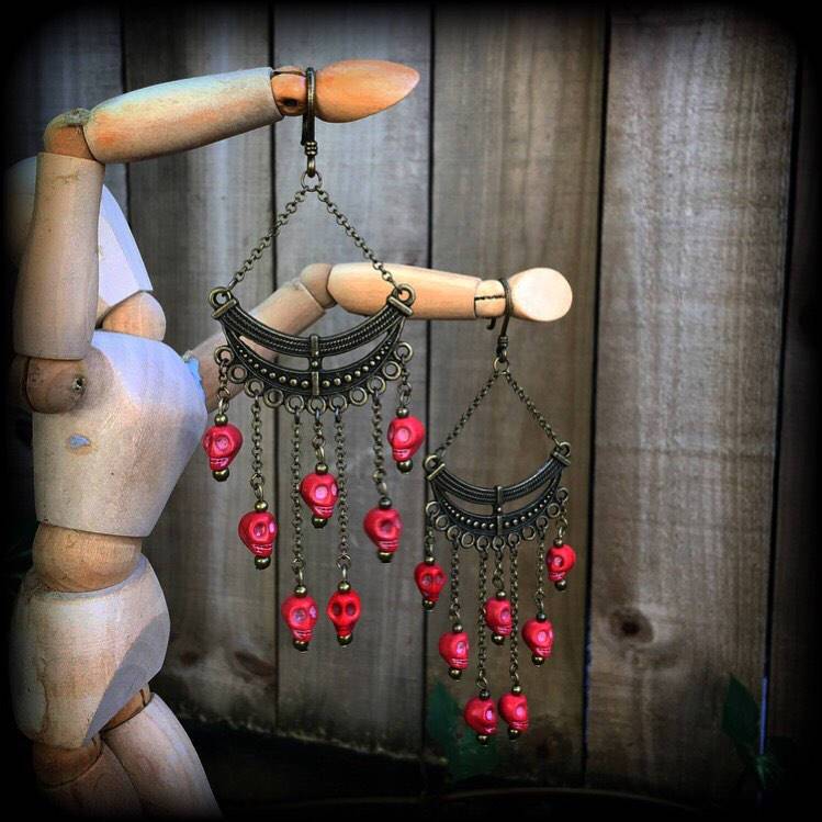 This pair of ear hangers from the Goddess 'Kali Maa' range features 7 small blood red howlite stone skulls a piece, hanging from an antique bronze tribal charm with antique bronze chain.
