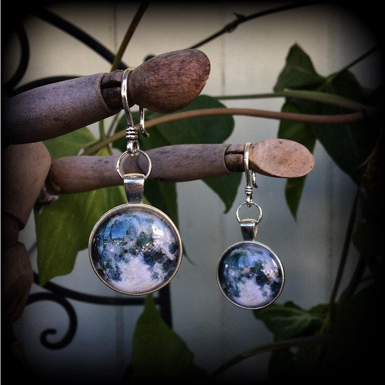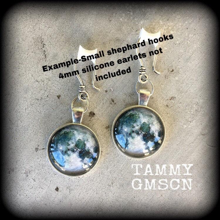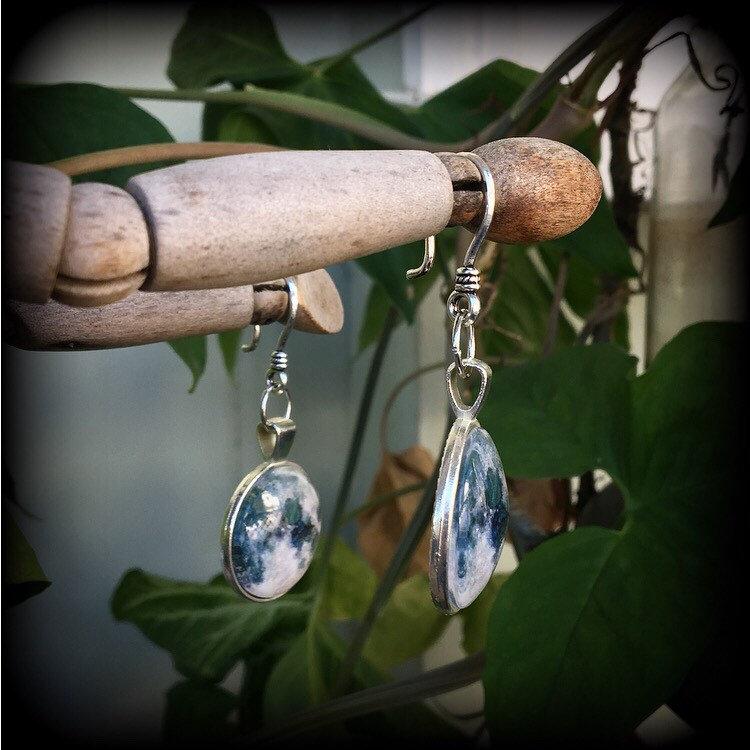 The antique silver 'Full moon' ear hangers are light weight and nice and dangly, measuring just over 5cms, and made on small antique silver shephard hooks to be worn in stretched lobes 3mm/8 gauge and larger, through silicone earlets.