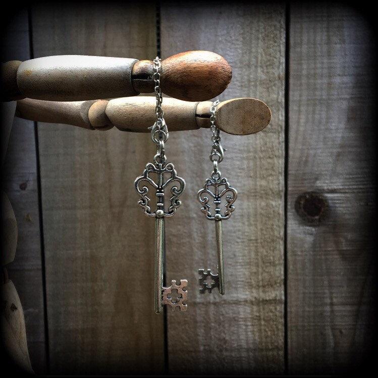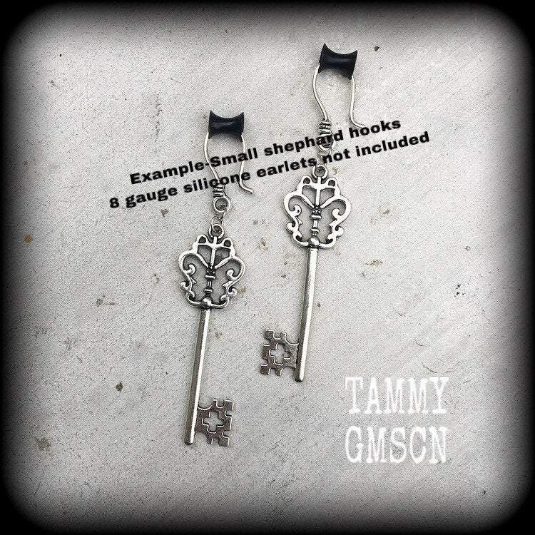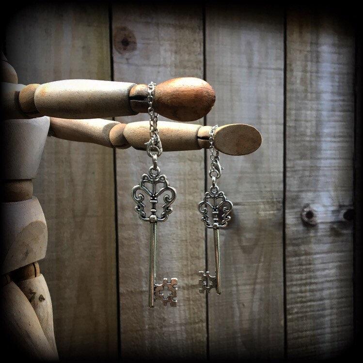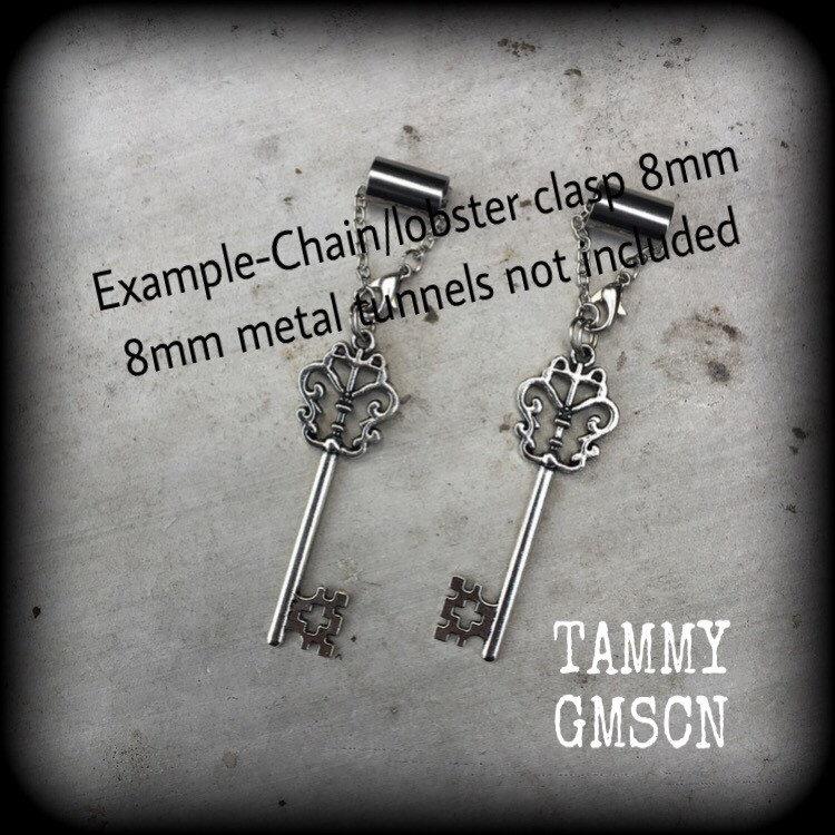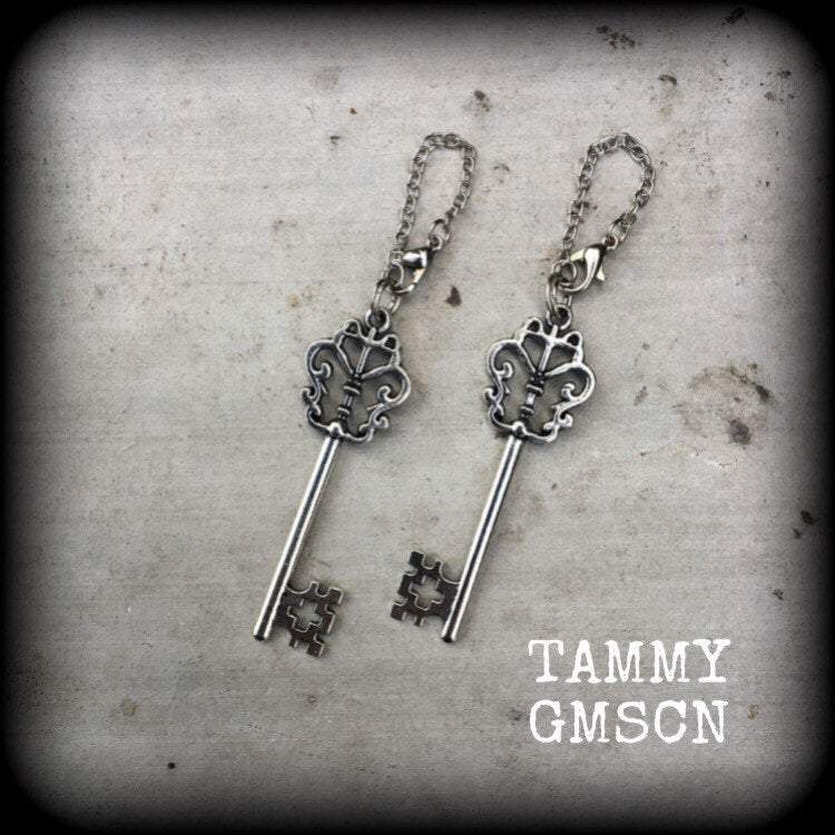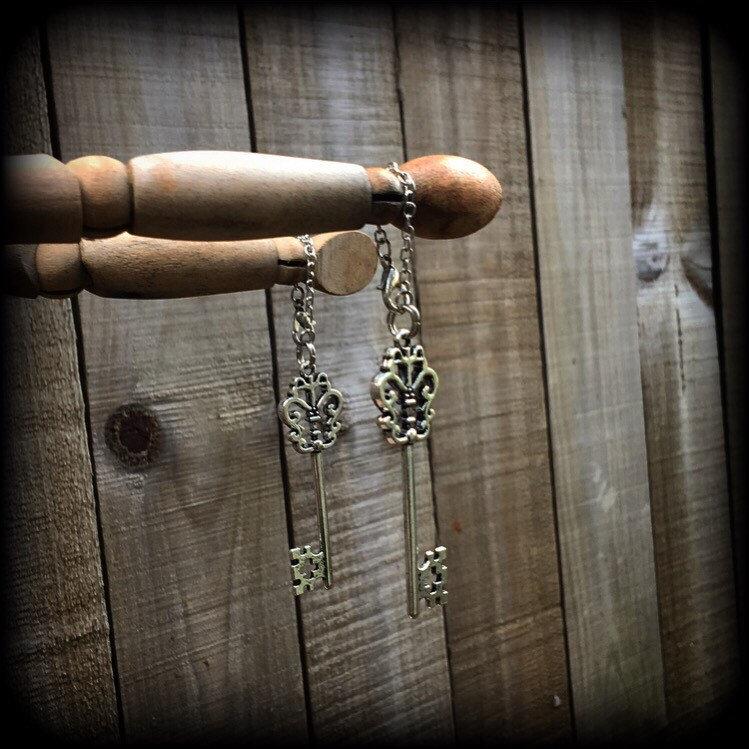 Measuring at just over 9cms from top to bottom these lovely dangly earrings feature an ornate antique silver key, made on a chain and lobster clasp, to be worn in silicone earlets in stretched ears.