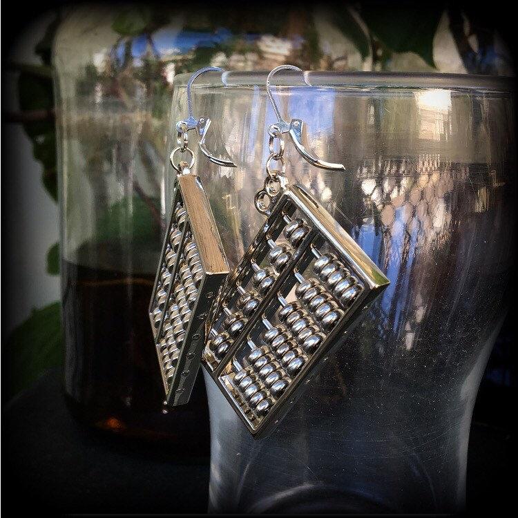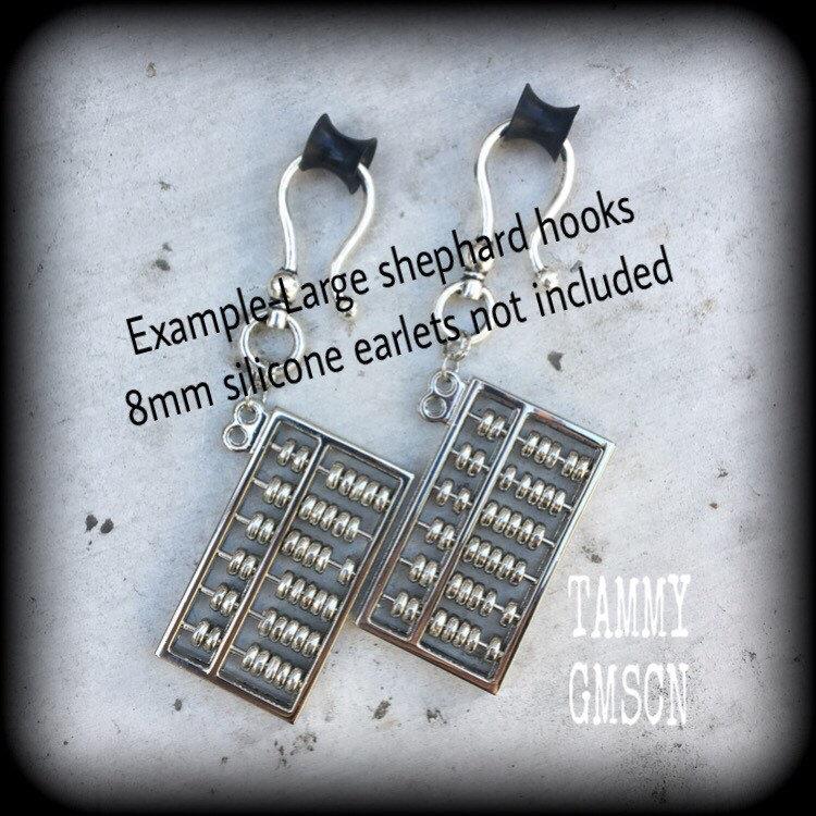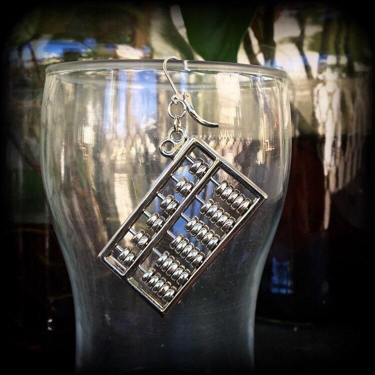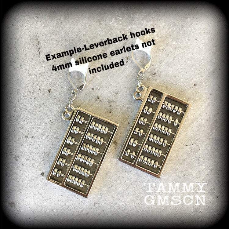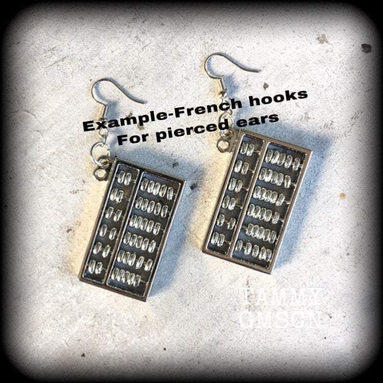Measuring at just over 9cms from top to bottom these lovely dangly 'Abacus' earrings feature a fully functional antique silver abacus, made on antiqued silver leverback hooks, to be worn in pierced ears or through silicone earlets in stretched ears.