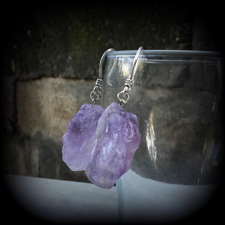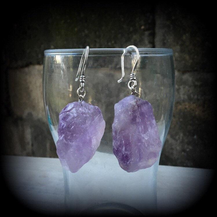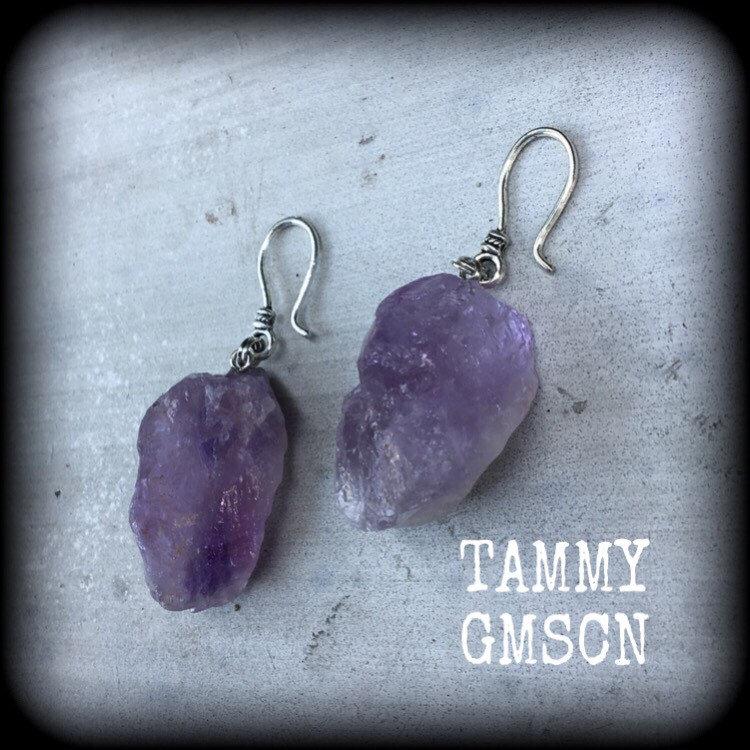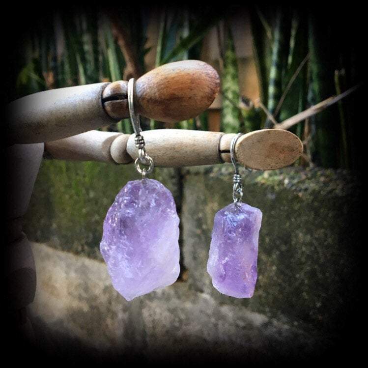 From the Gemstone Fossil Wood range are these gorgeous raw rock Amethyst Quartz Ear weights, made with small antique shepherd hooks to be worn specifically through earlets in stretched lobes.