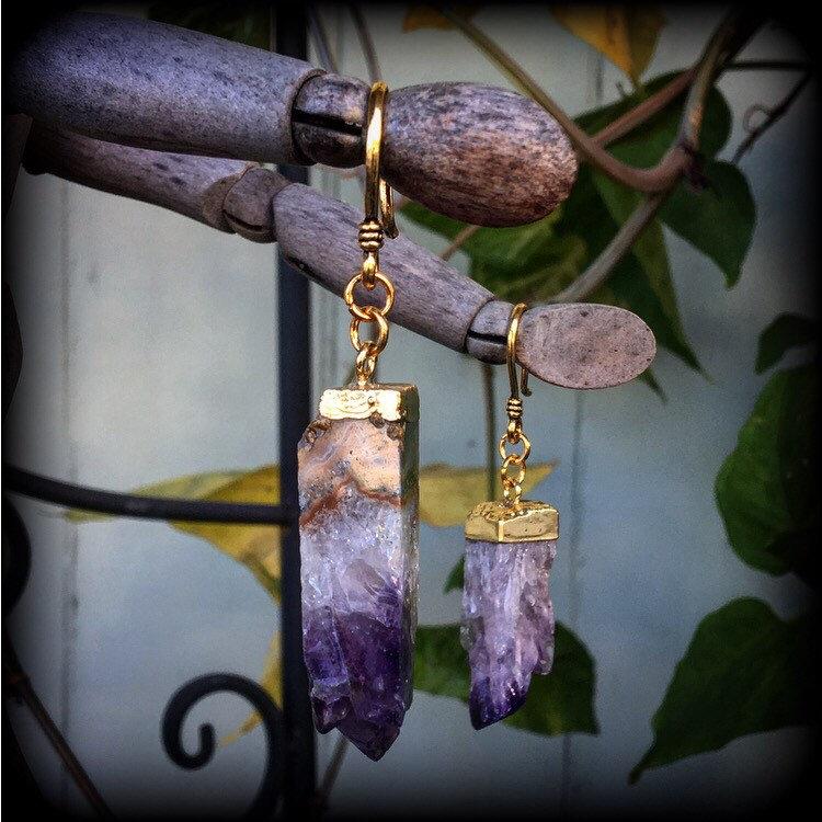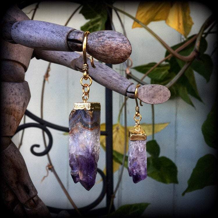 From the Gemstone Fossil and Wood range are these gorgeous Raw Amethyst Quartz Earrings, made with small antique gold shephard hooks, to be worn specifically through earlets in stretched lobes.