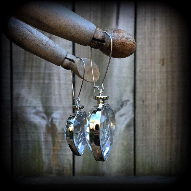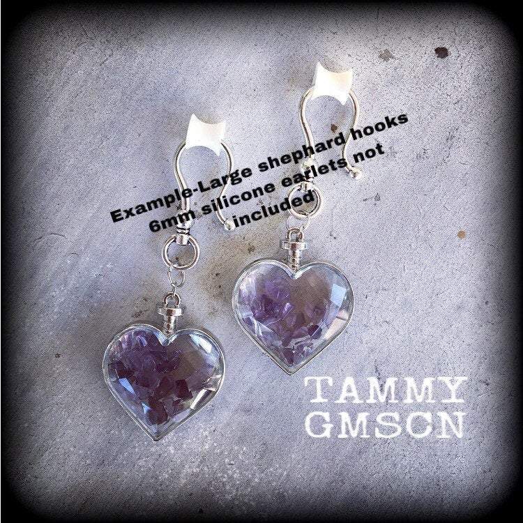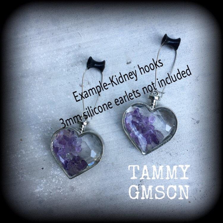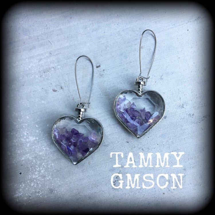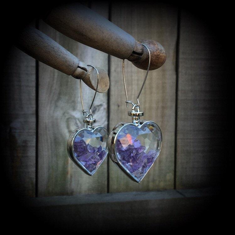 These are a pair of gorgeous plump iridescent 'Amethyst Heart' faceted earrings, filled with beautiful purple amethyst chips, made on antique silver kidney hooks, to be worn in pierced ears or through silicone earlets in stretched lobes.