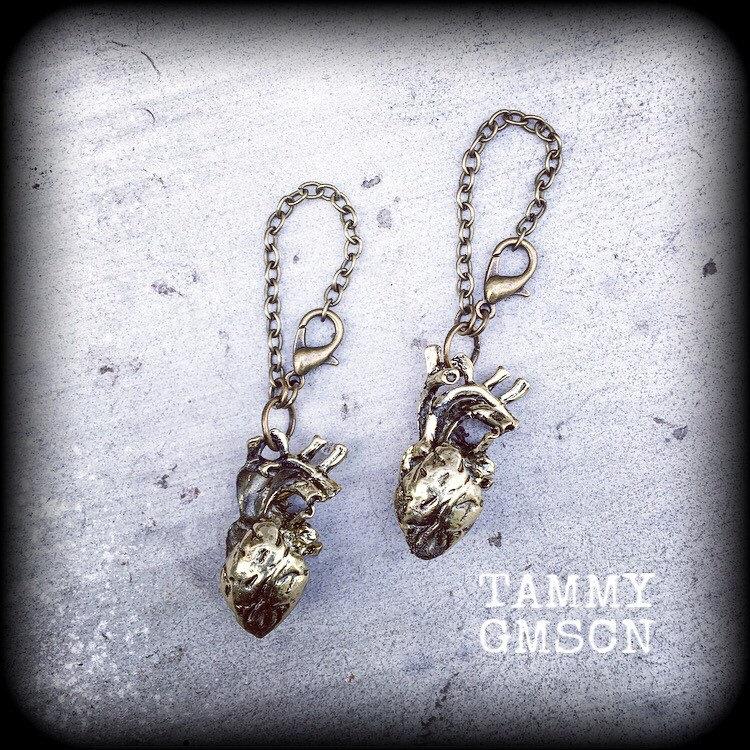 The Halloween 'Anatomical Heart' earrings weigh in at 10 grams each, measuring at 6cm each, and are perfect for pierced ears, or those of us with stretched lobes that dont like to wear anything too big or too heavy.