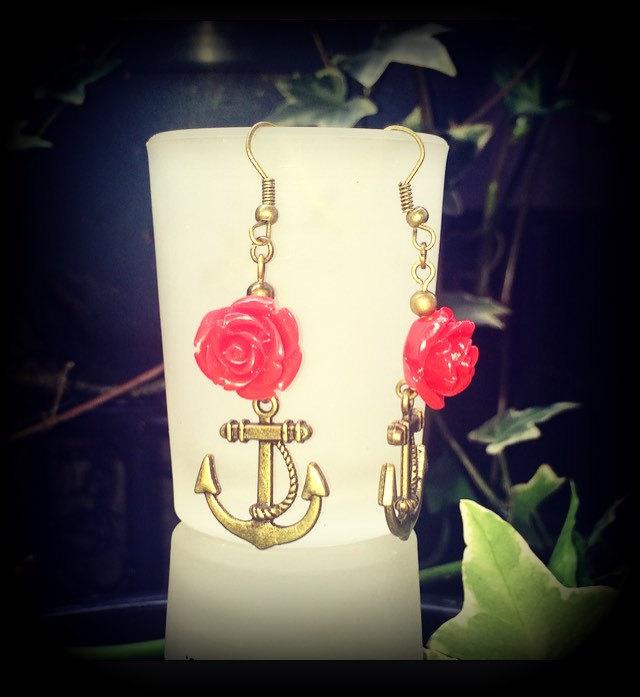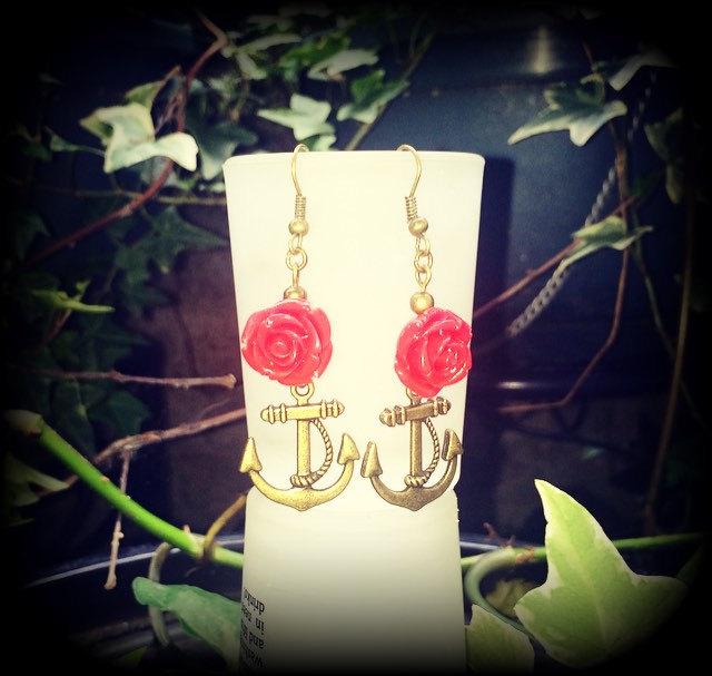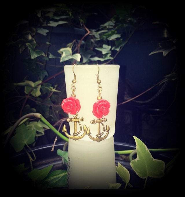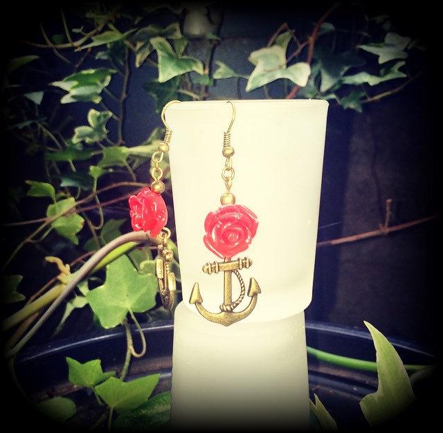 The 'Old School Anchor and Rose' earrings are light weight and nice and dangly, featuring a cute little antique bronze anchor with a gorgeous red rose charm, measuring almost 6cms and made on antique bronze french hooks, suitable to be worn through pierced ears.