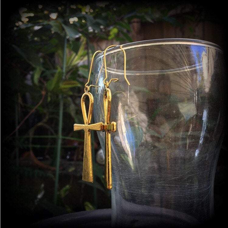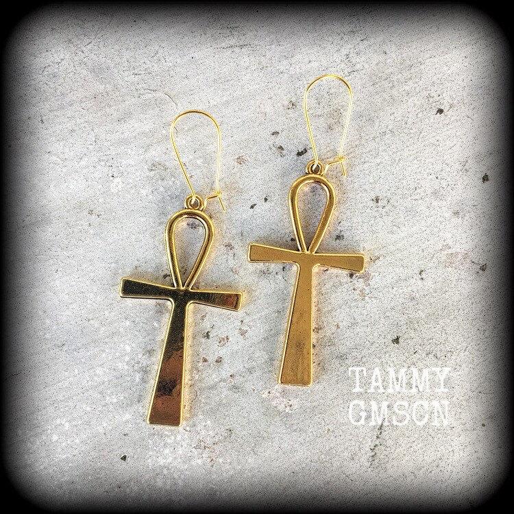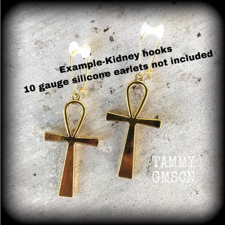 The 'Gold ankh' earrings measure just on 7 cms, nice and light weight (4 grams a piece), suitable for both pierced ears and as super light weight ear hangers for stretched lobes.