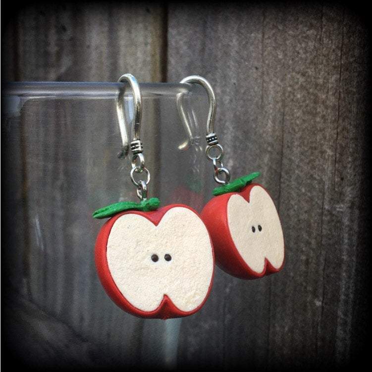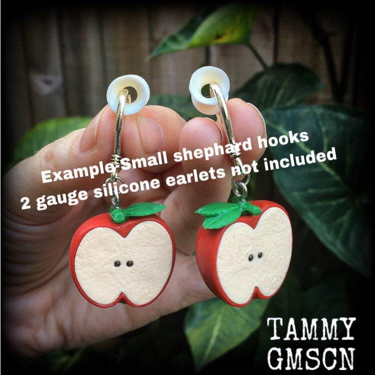 This pair of gorgeous 'Apple' earrings measures just on 6cms from tip to tip, and features small antique silver shephard hooks, to be worn through stretched lobes with silicone earlets from 3mm/8 gauge and larger. This is the only pair of these apple earrings I have, they will make a great unique gift and can be made for pierced ears as well!