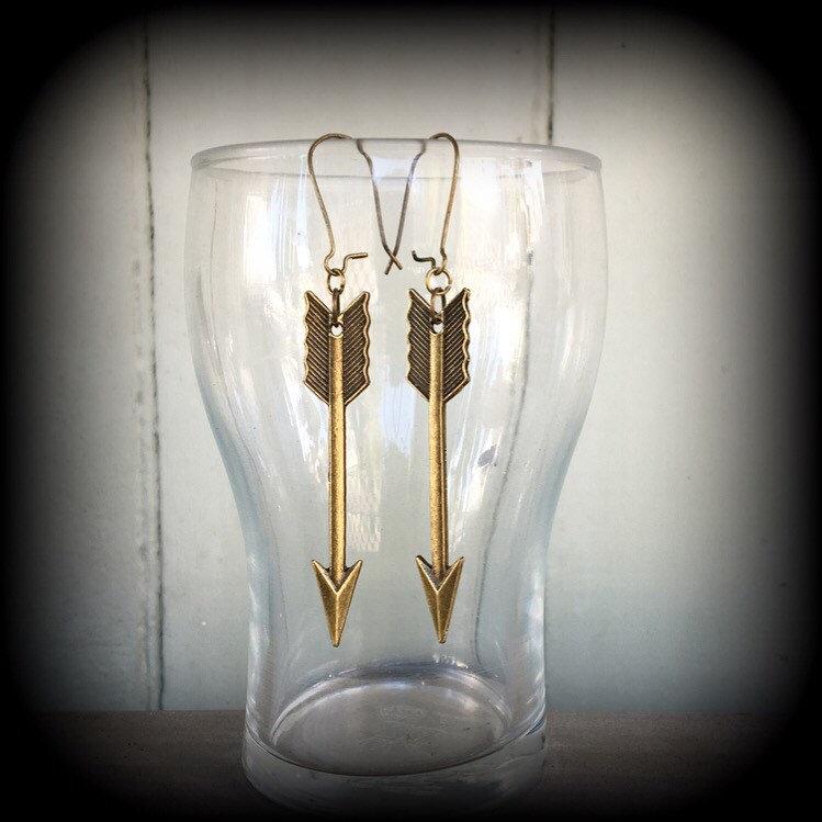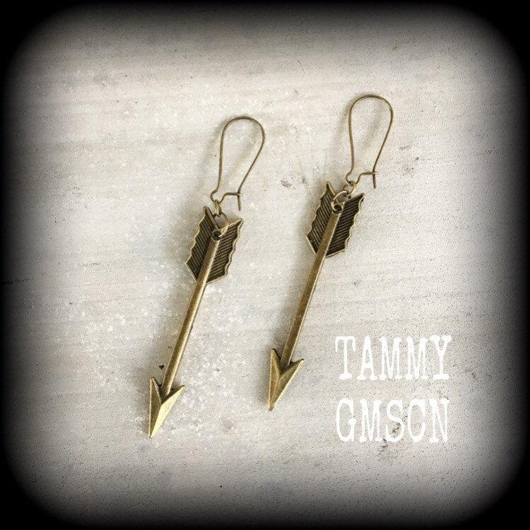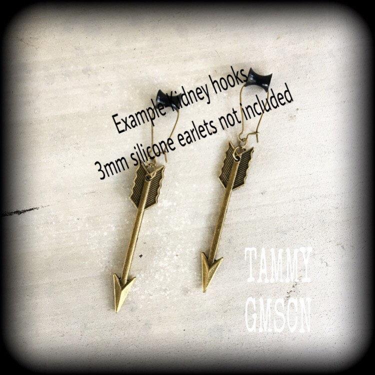 Measuring at just under 9cms from top to bottom these lovely dangly light weight earrings feature an ornate antique bronze arrow. Made on an antiqued bronze kidney hook, these earrings are suitable for pierced ears, or stretched lobes when worn through silicone earlets.