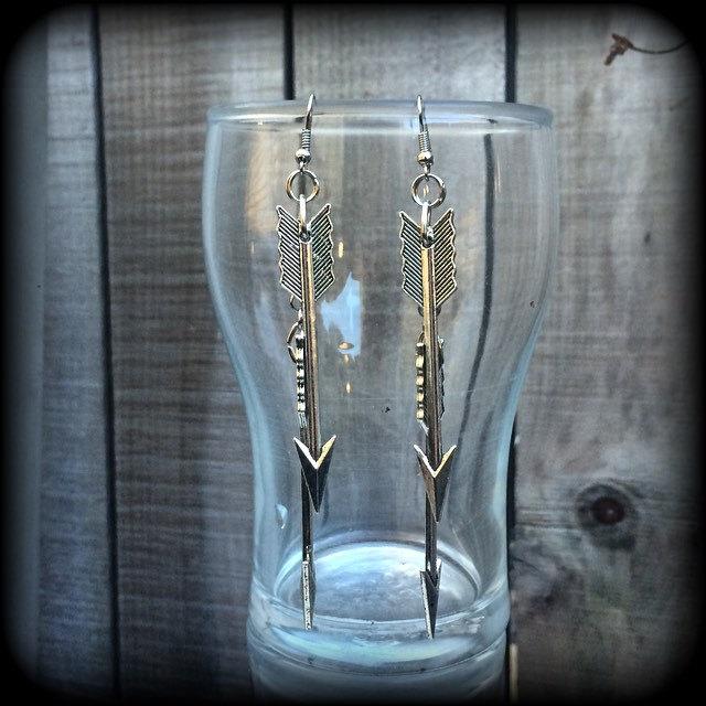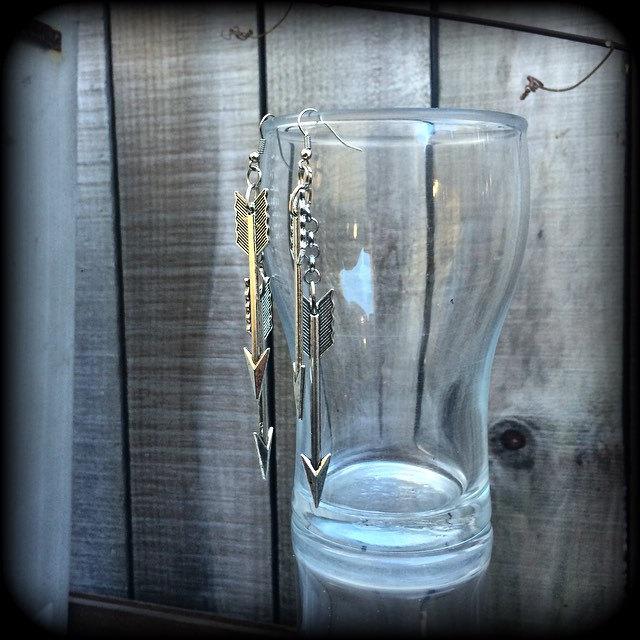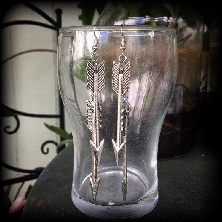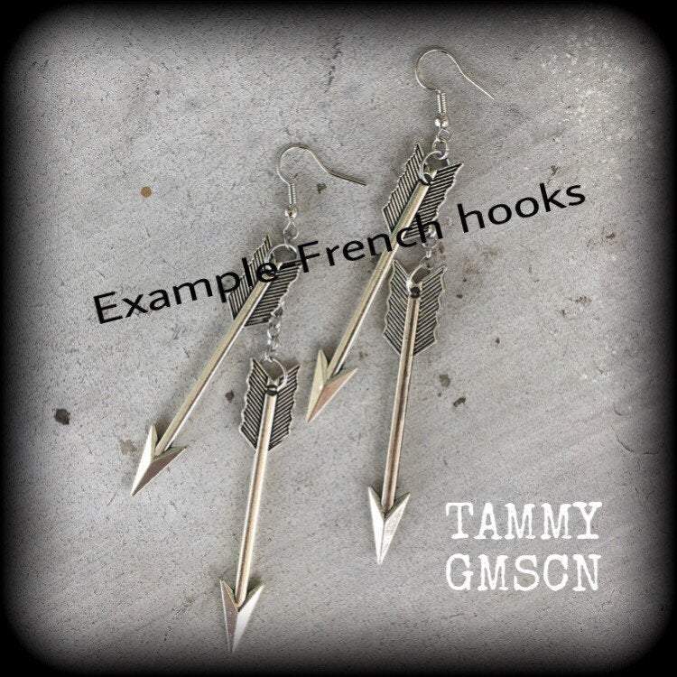 Featuring two large Antique Silver Vintage arrows hanging from antique silver chain attached to antique silver french hooks, these earrings measure just on 11cms from tip to tip.