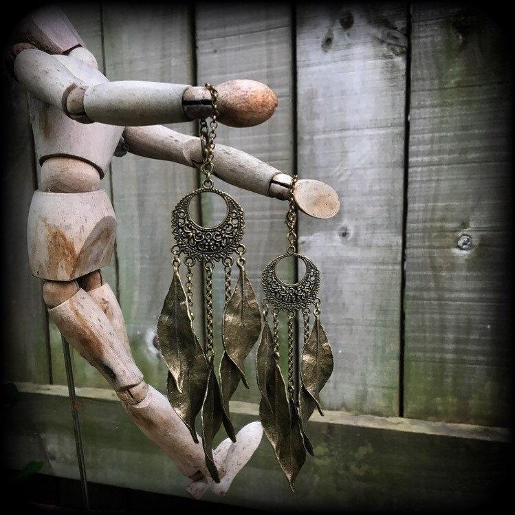 Featuring gorgeous bronze leaves hanging from an ornate antique bronze charm with antique bronze chain, made with antique bronze chain and lobster clasp, to be worn through stretched ears with silicone earlets from 4mm/6 gauge.