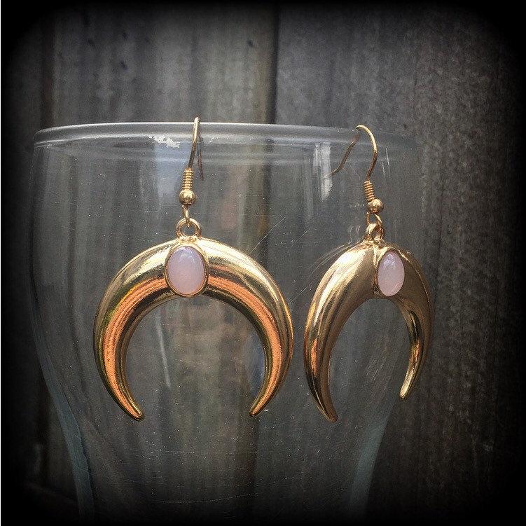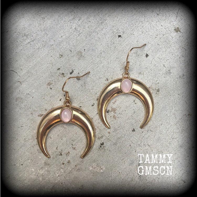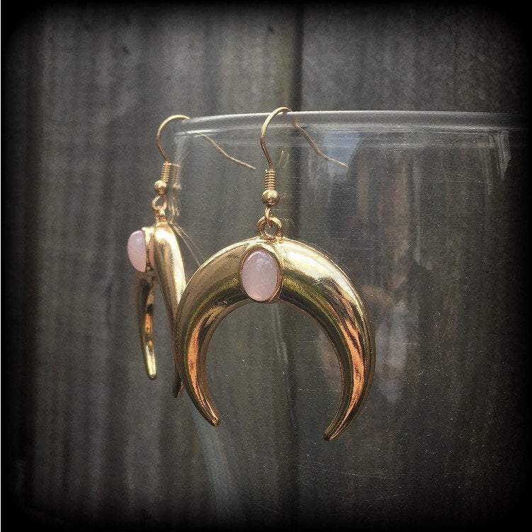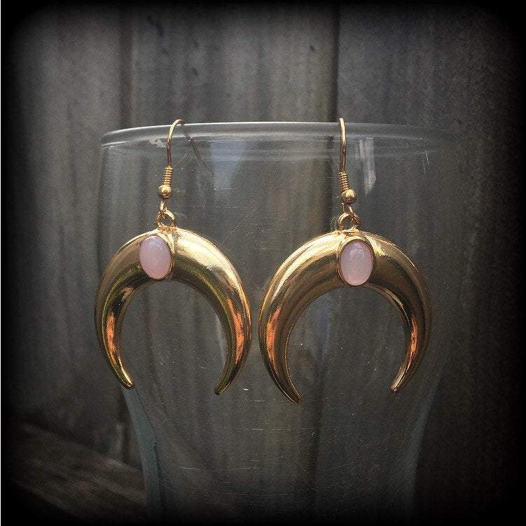 These champagne tone antique gold 'Double horn' earrings have been made on french hooks for pierced ears and feature a lovely rose pink acrylic cabochon.