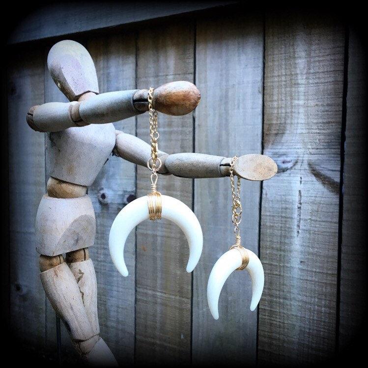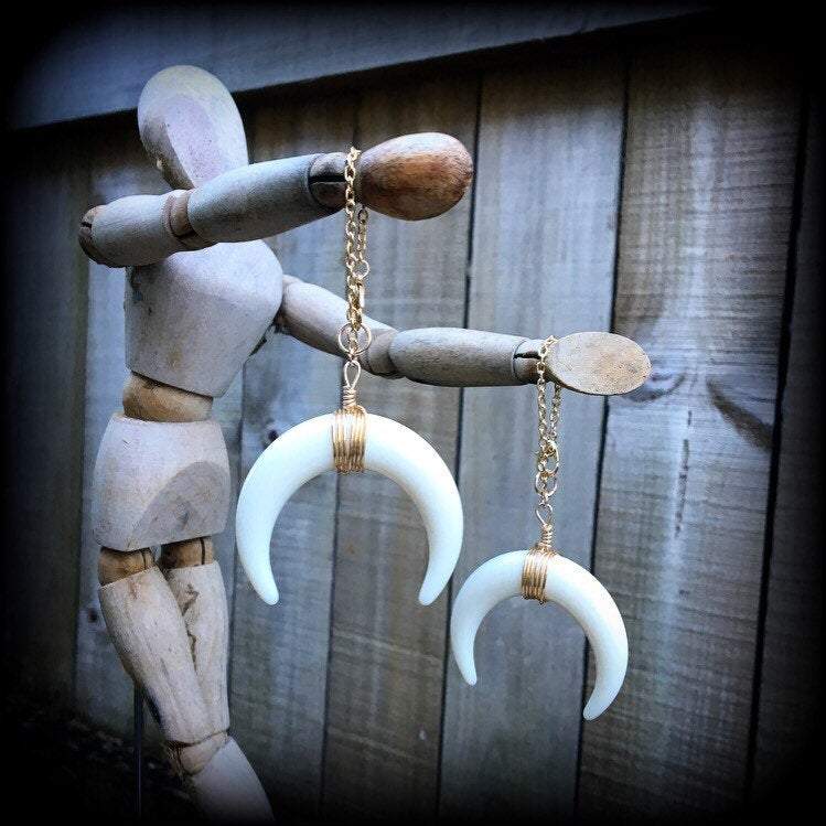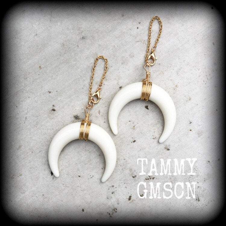 These acrylic 'Double horn' earrings have been made on lobster clasp and chain to be worn through silicone earlets in stretched lobes from 8mm/0 gauge.