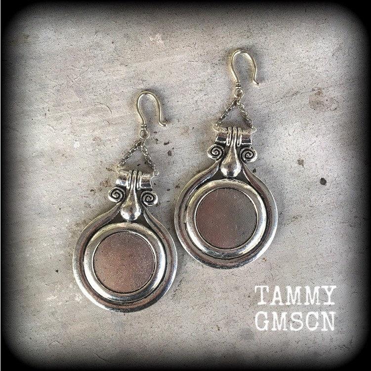 Measuring approx 12cms from top to bottom, these earrings weigh approx. 12 grams a piece, not too heavy. These have been made on small antique silver shephard hooks, to be worn through silicone earlets in stretched lobes from 3mm/8 gauge.