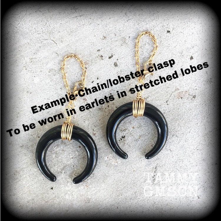 *I recommend shephard hooks be worn through silicone earlets in stretched lobes, they sit snug and look great, while chain and clasps are suitable to be worn through metal tunnels or silicone earlets.