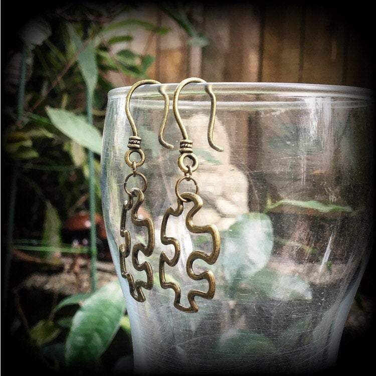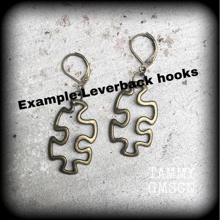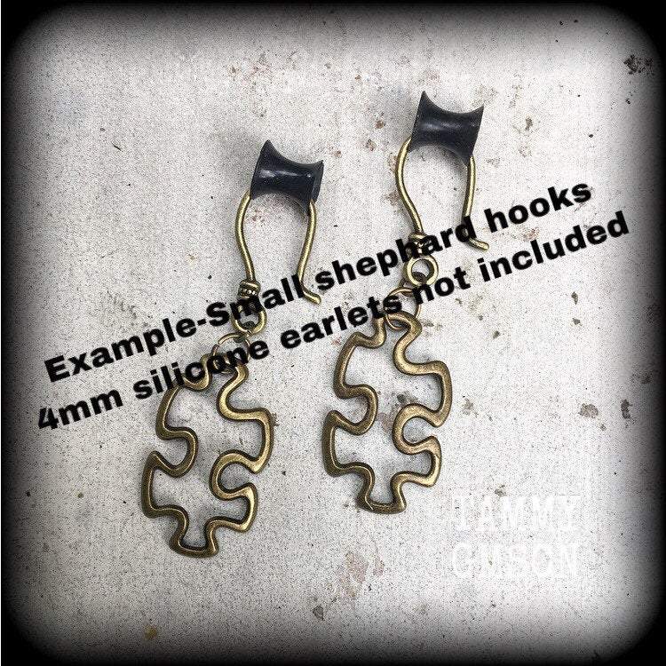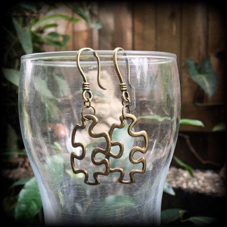 Super cute and super light weight, the antique bronze 'Puzzle Piece' earrings measure just on 5cm from tip to tip and have been made on small antique bronze shephard hooks, suitable to be worn through stretched lobes with silicone earlets from 3mm/8 gauge.