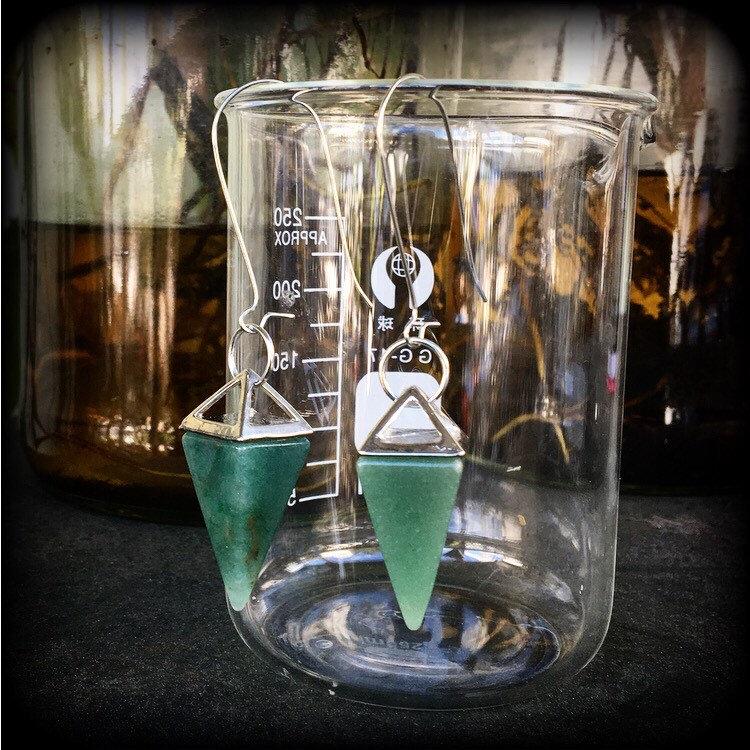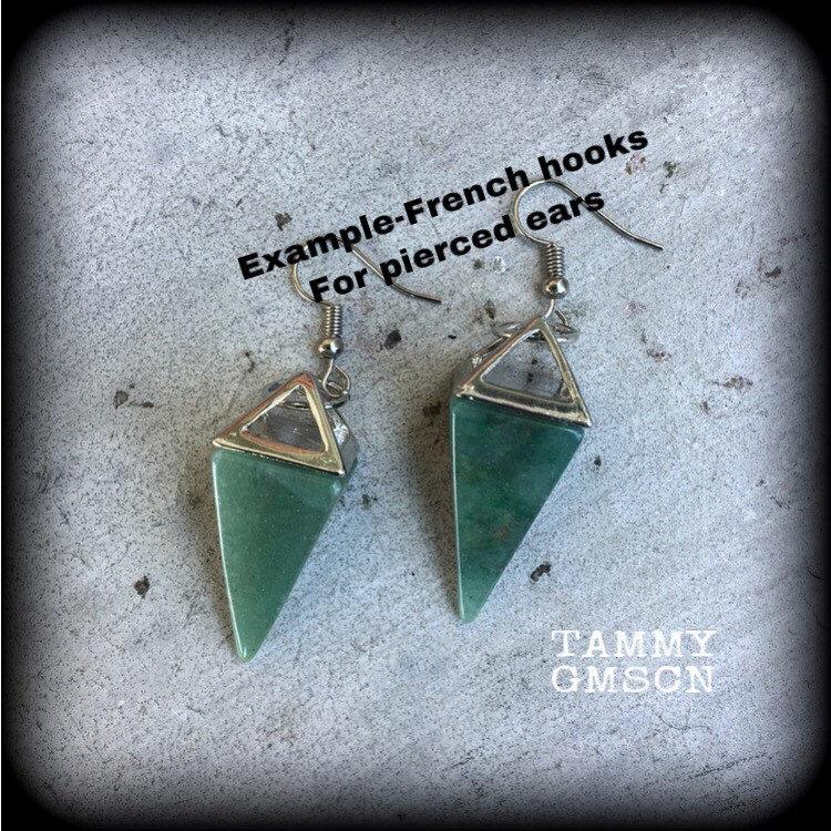From the Gemstone Fossil and Wood range are these gorgeous minimalist Aventurine Quartz Pyramid Earrings, made with antique silver kidney hooks, to be worn in pierced ears or through earlets in stretched lobes from 2mm.