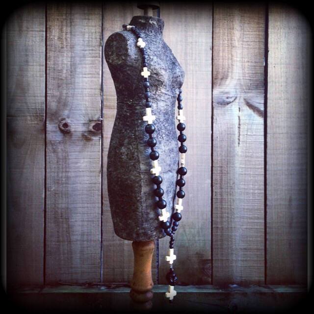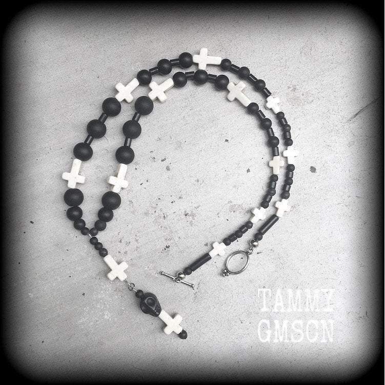 The 'Samedi', inspired by Voodoo Loa Baron Samedi featuring pitch black polished onyx stone beads with dirty white stone inverted crosses.