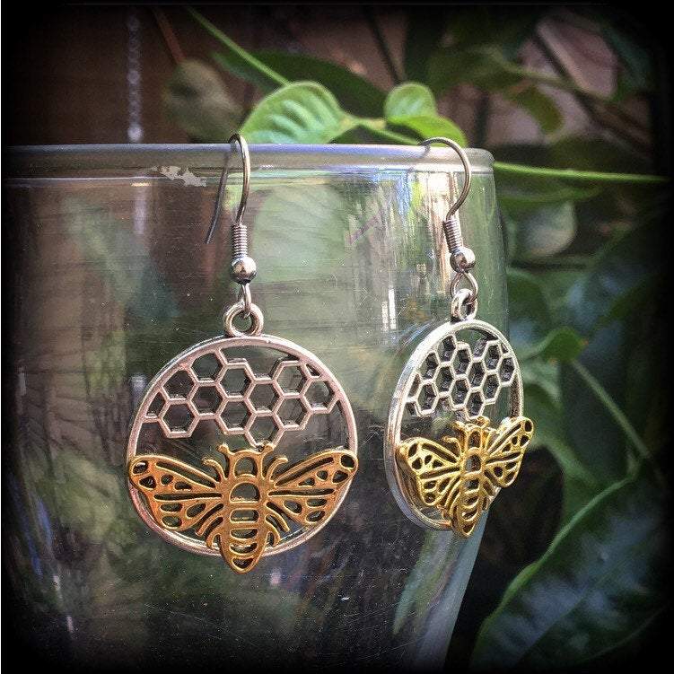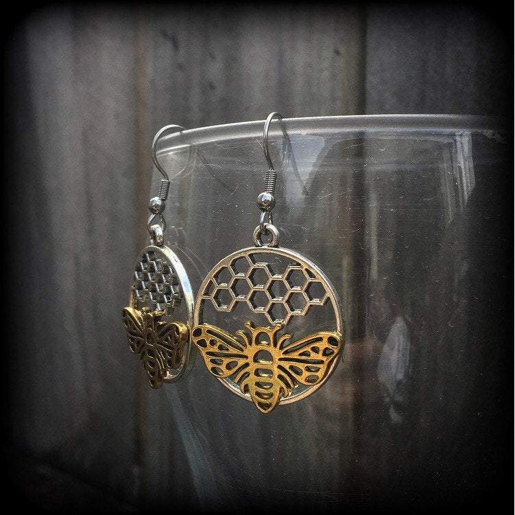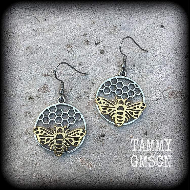 Bee earrings Bee hive earrings Hexagon earrings Geometric earrings Insect Tunnel earrings Plug earrings Hanging gauges Tunnel dangles Plugs