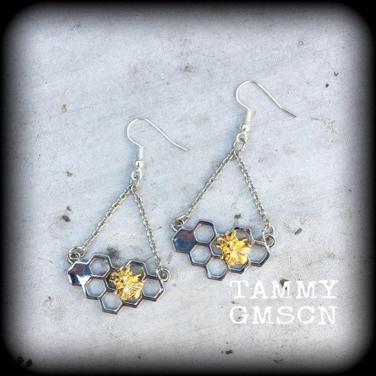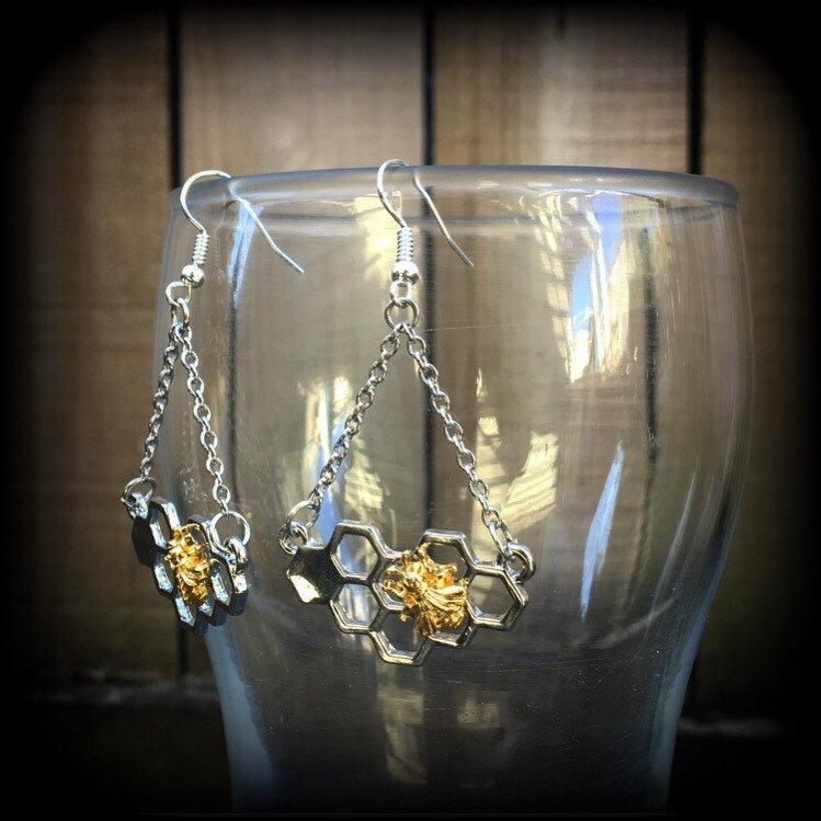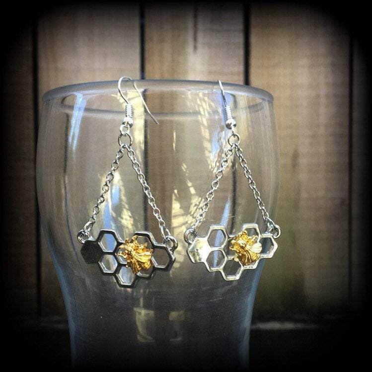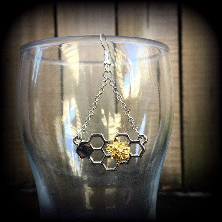 The 'Hive' earrings feature a tiny gold tone bee sitting atop a silver tone bee hive, dangling from chain and french hooks.