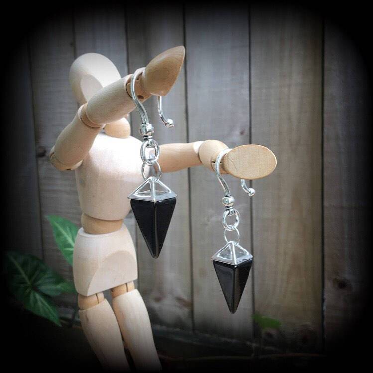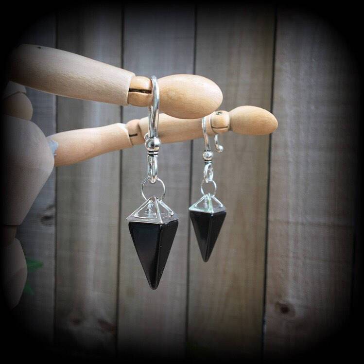 From the Gemstone Fossil Wood range are these gorgeous minamalist Black Onyx Pyramid Ear weights, made with large antique silver shephards hooks, to be worn specifically through earlets in stretched lobes.