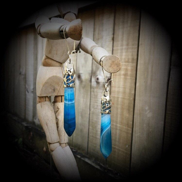 This pair of blue agate earrings are suitable for both pierced ears and stretched lobes, made on antique silver kidney hooks.